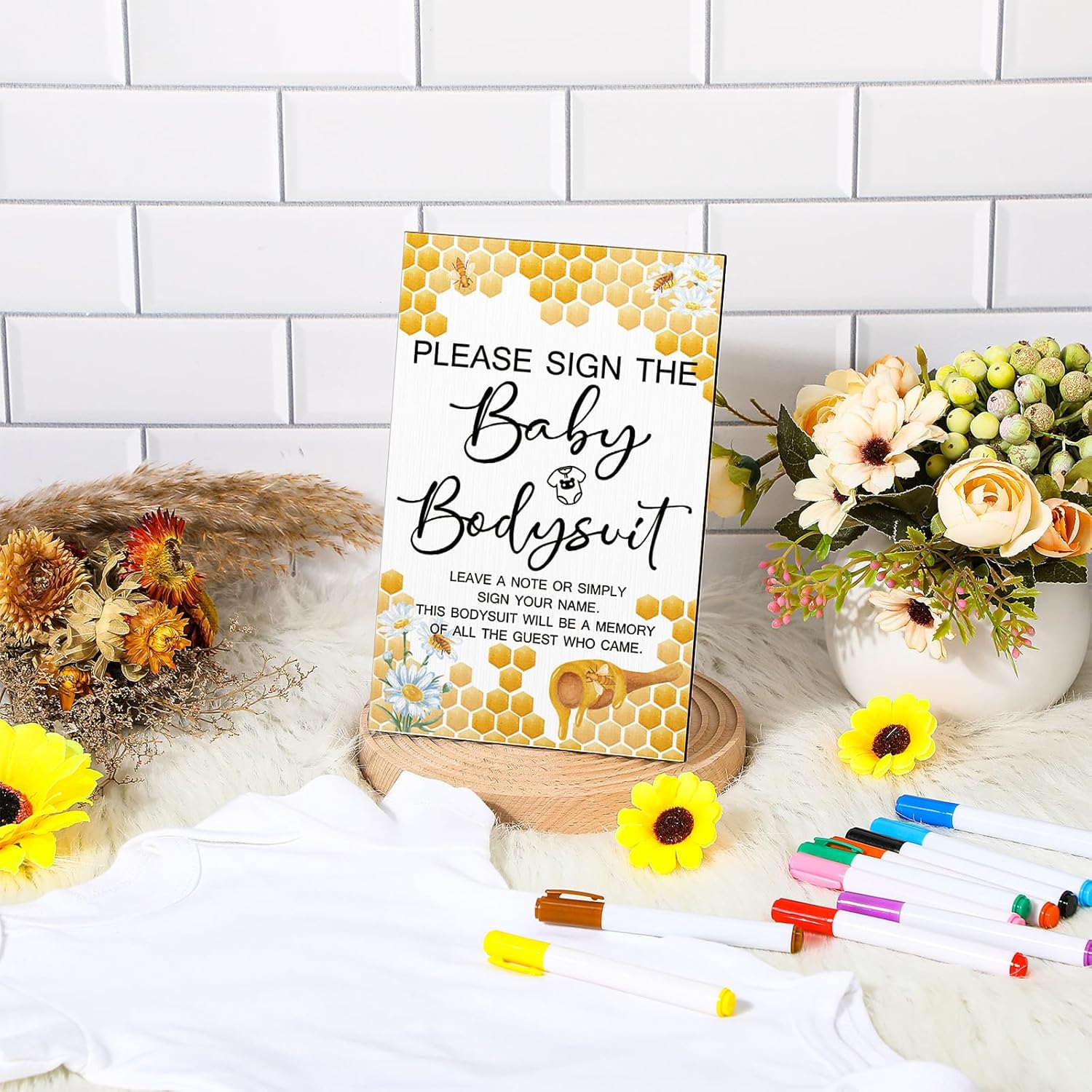 Qunclay 12 Pcs Baby Bodysuit Baby Shower Game Include 1 Game Wooden Sign Tabletop Decor 1 White Blank Newborn Bodysuit 10 Fabric Marker for Gender Reveal Party(Bee)