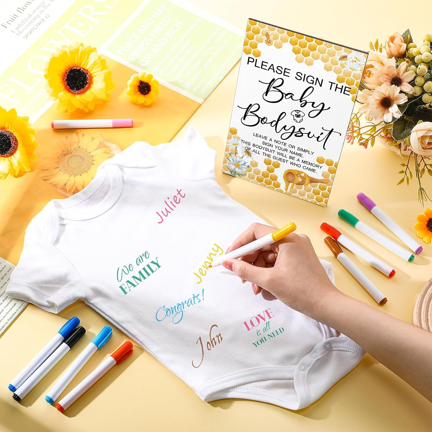 • Nice and Complete Set: there is 1 piece of wooden sign, 1 piece of white bodysuit for baby, and 10 pieces of colorful markers, abundant quantities and nice combinations to satisfy your daily using and baby shower needs