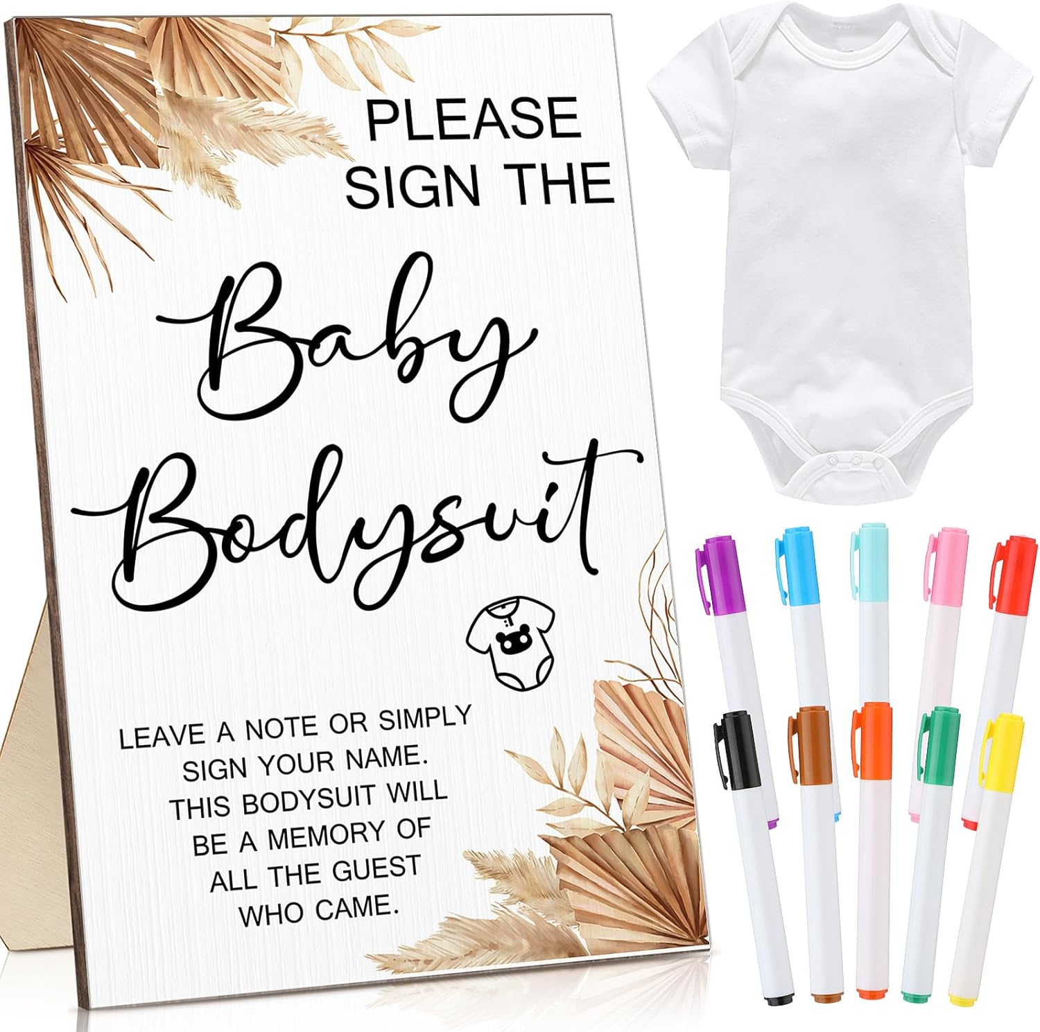 Qunclay 12 Pcs Baby Bodysuit Baby Shower Game Include 1 Game Wooden Sign Tabletop Decor 1 White Blank Newborn Bodysuit 10 Fabric Marker for Gender Reveal Party(Boho)
