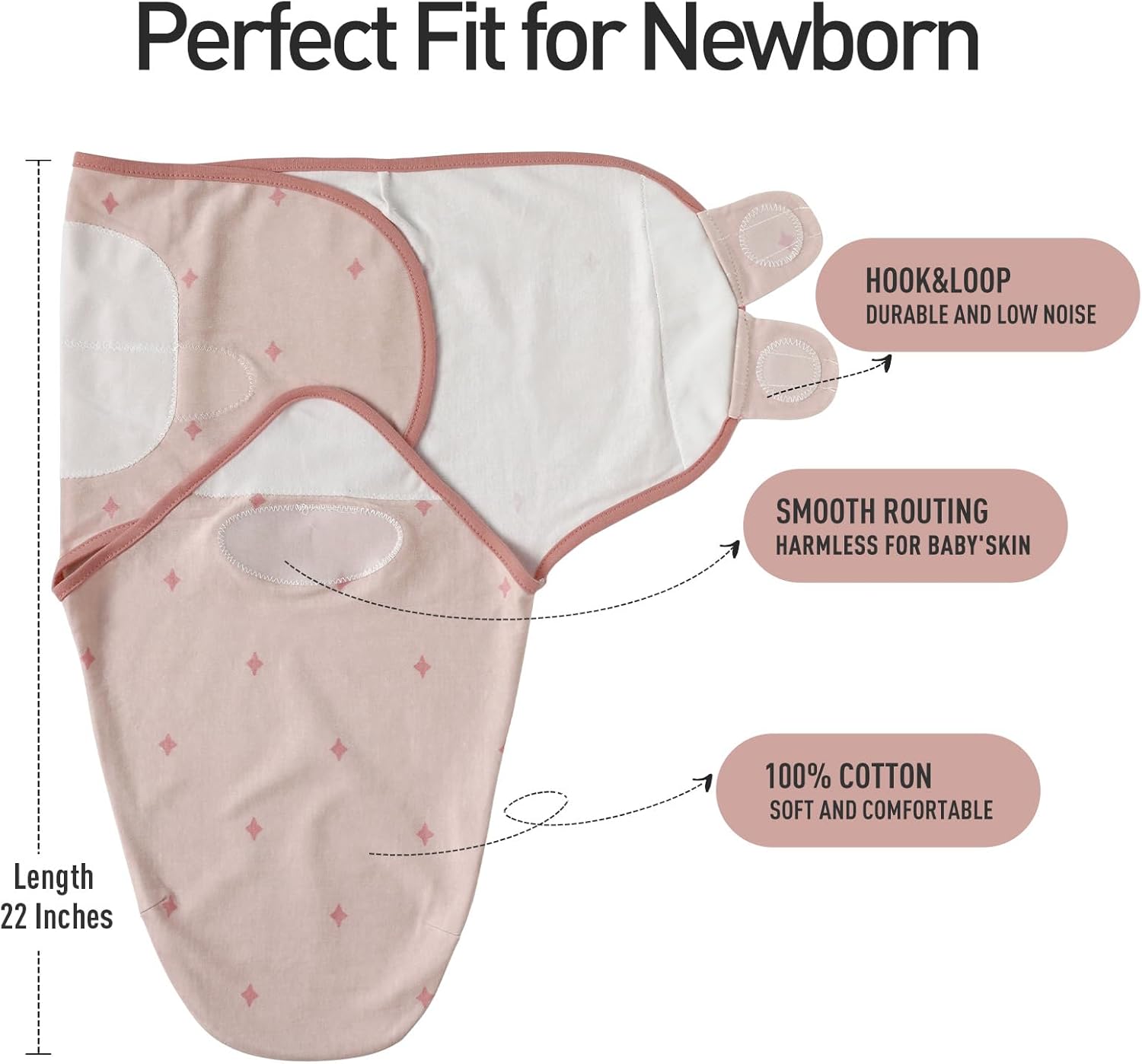 • Adjustable: Swaddling your baby snugly becomes easy with our adjustable fabric wings that fasten securely with hook and loop to create the perfect fit. You can adjust the tightness of the baby swaddle wrap with your baby's growth