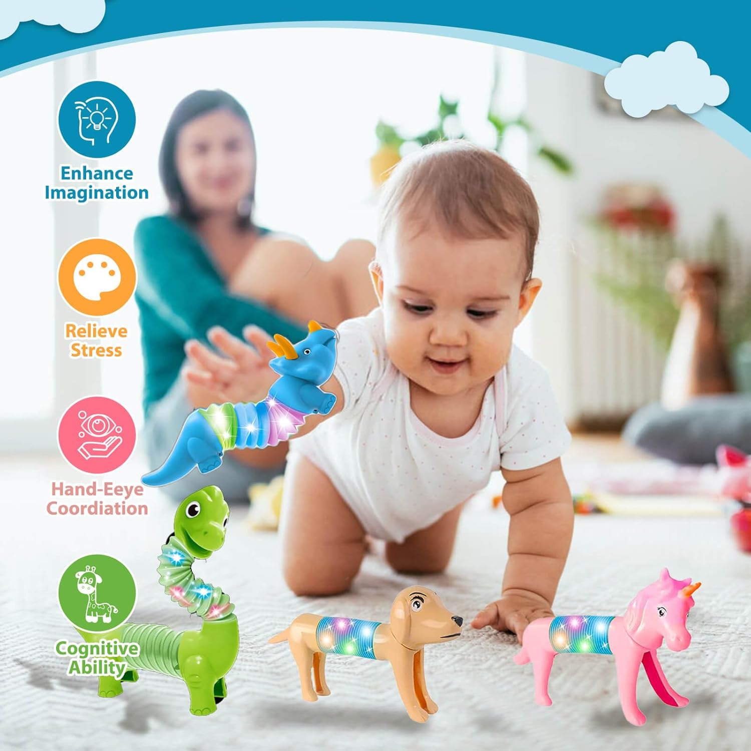 • Pop Tubes LED Light Toys: Pop tubes fidget toys with led lights design;You just need to tap on the tube and it will flash;You can create your own light show and party at dark
