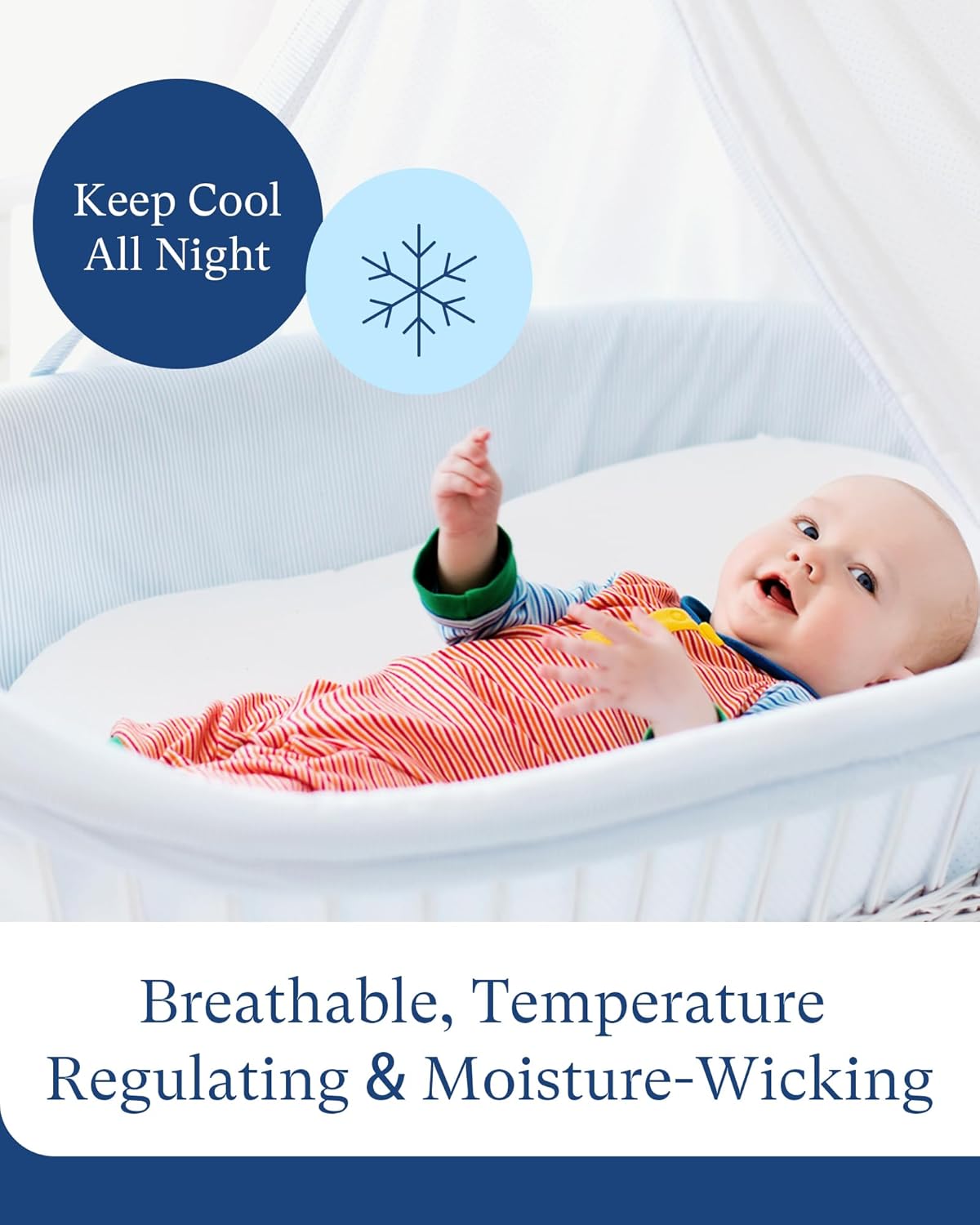• UNIVERSAL SIZE: Features deep 5'' pockets and durable 360° elastic stitching the entire way around to ensure a perfect fit on all standard bassinet pad and moses basket oval rectangle pad mattress bedside sleeper.
