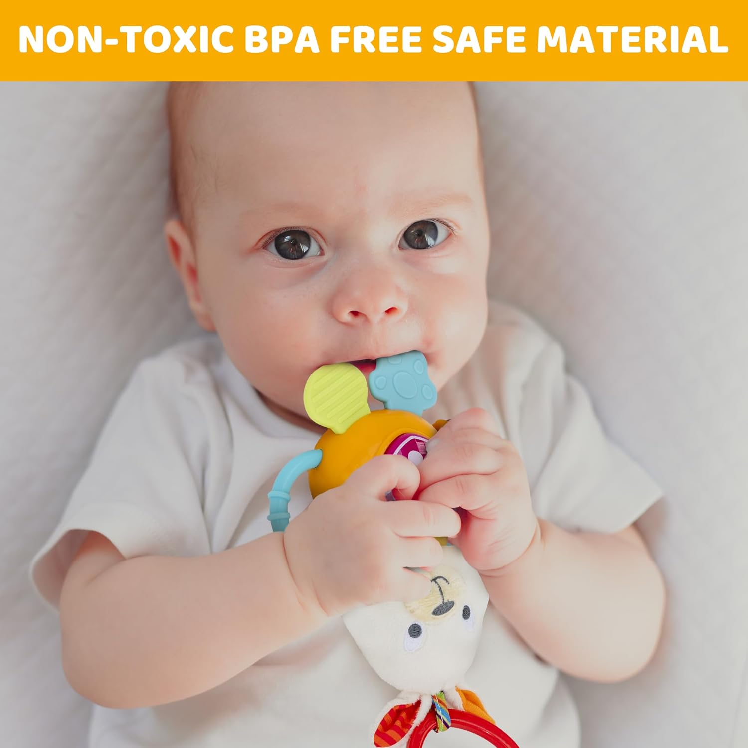 • LIGHTS AND SOUNDS – This teether toy has a cheerful light-up heart-shaped button that can be easily pressed by even the tiniest hands to play musical melodies to soothe the babies