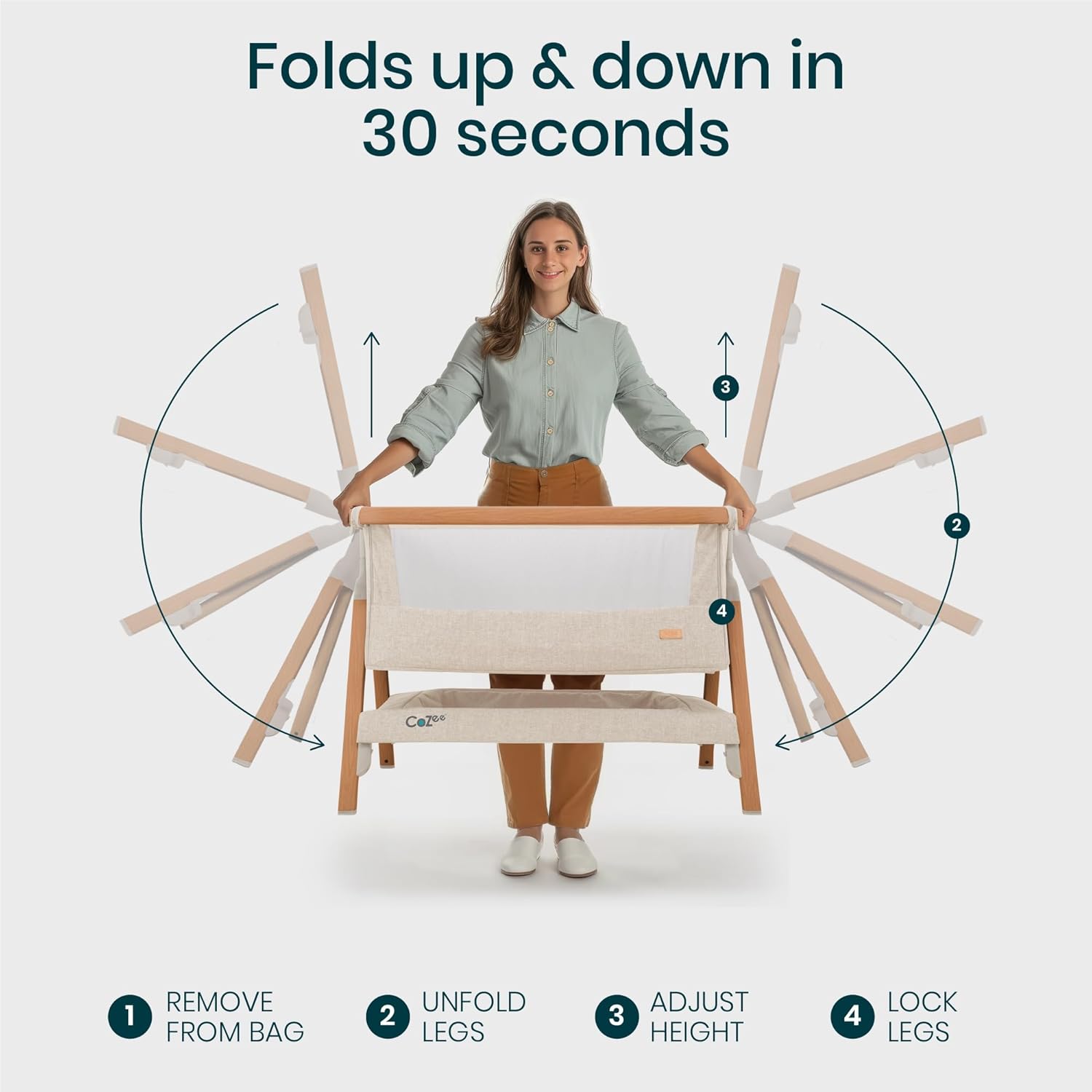 - SET UP IN 30 SECONDS - Thanks to our innovative fast-folding mechanism, the baby bedside bassinet is ultra quick to set up! The wood-effect legs lock securely into place to keep the bedside crib stable.