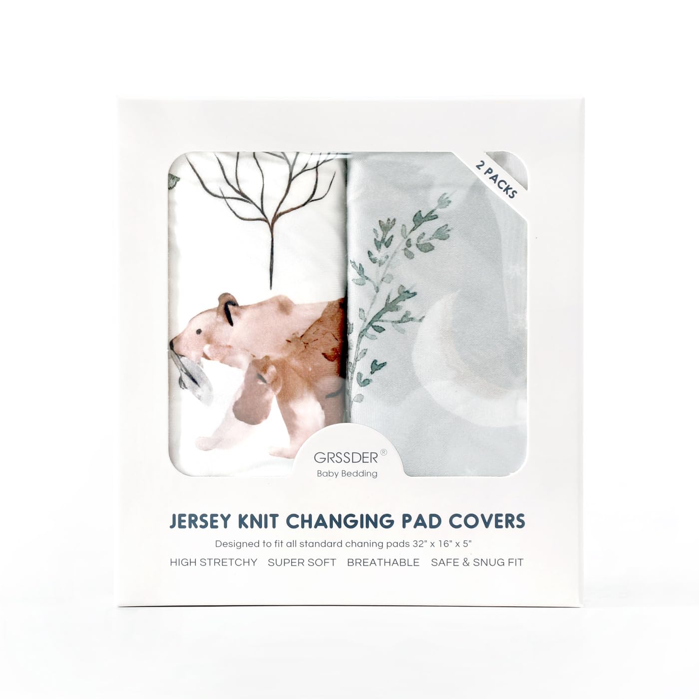 GRSSDER Stretch Ultra Soft Jersey Knit Changing Pad Cover Set 2 Pack, Change Table Pad Covers Fit 32"/34" x 16" Pads Safe and Snug, Pretty Pattern for Boys and Girls, Bear and Wolf Print