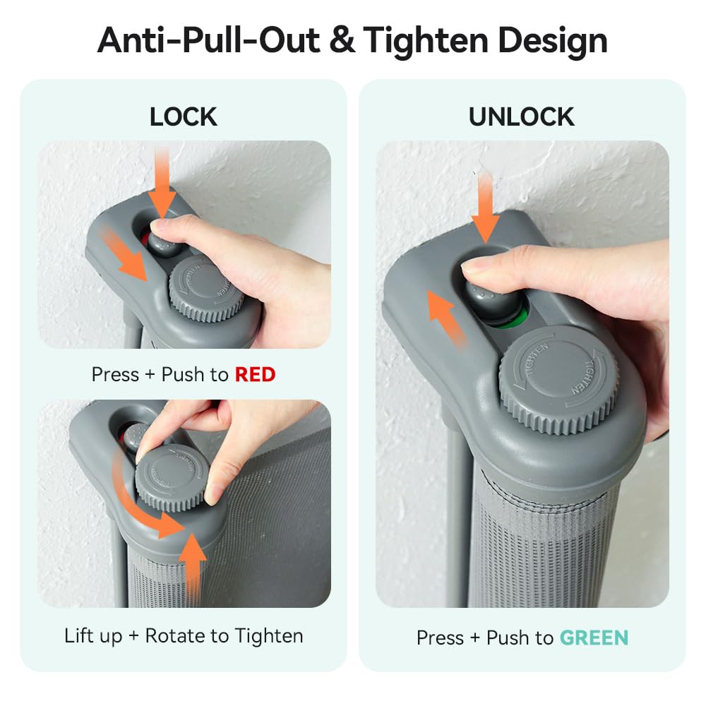 • Lockable Safety Design: The retractable pet gate features a lockable design at the top for added security. A press and slide switch locks or unlocks the extra long pet gates, with red and green indicators for clear understanding. The hidden lock keeps the child gate secure from inquisitive hands. NOTICE: When the indicators shows red, it can only be locked and not stretched outward