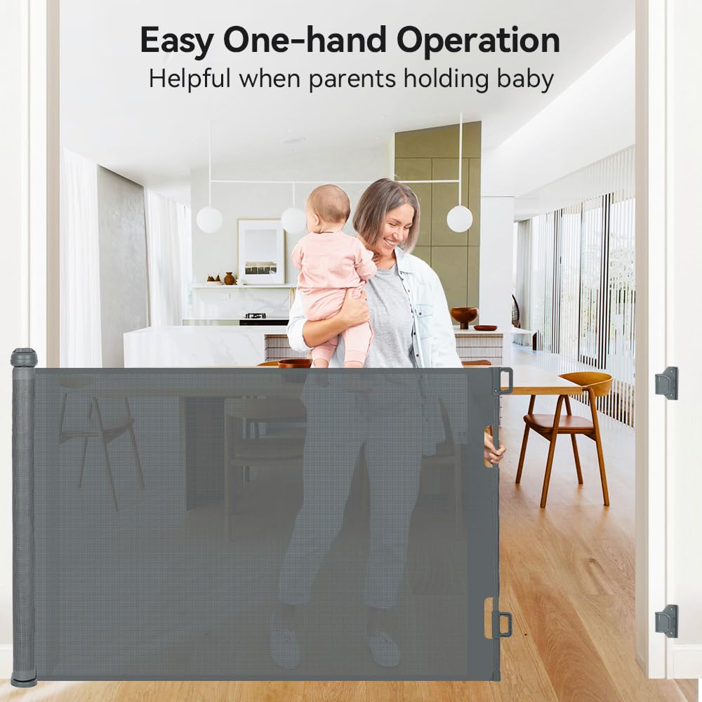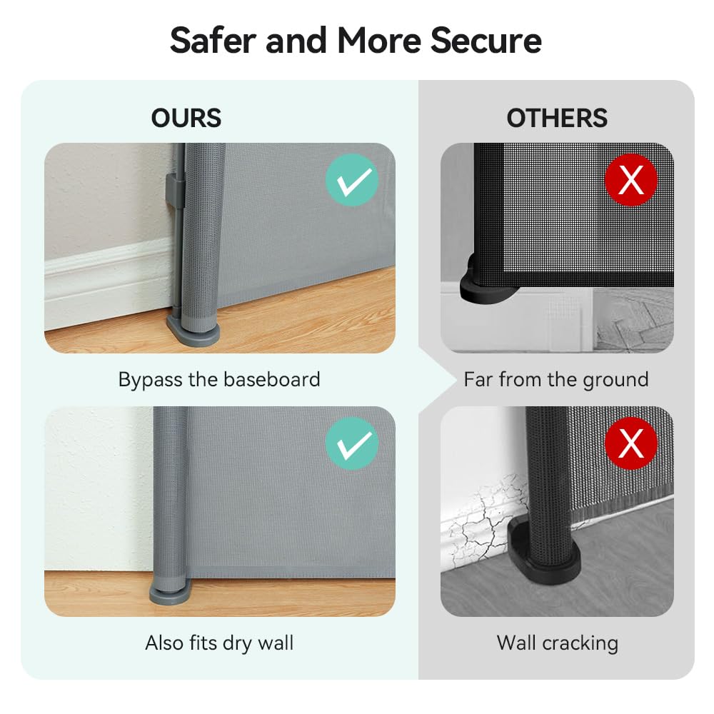 • Secure&Sturdy Baby Gate: No need to worry about sneaky escapes with this safety gate! Its improved design includes 3 floor hooks for solid anchoring. Plus, a rotating knob tightens the mesh door net, preventing sagging and effectively confining young children or pets. Made from high-quality, sturdy mesh, the baby gates extra wide resists warping and wrinkling