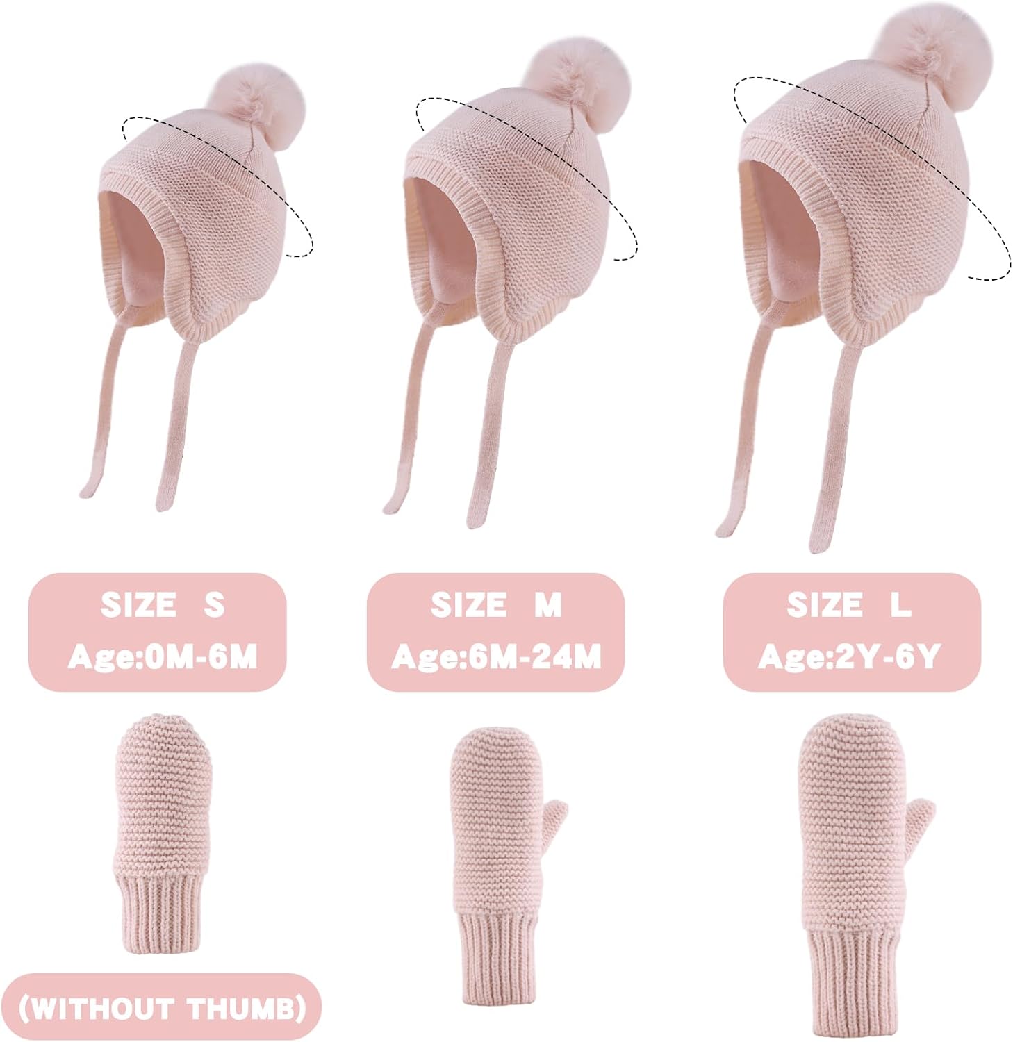 • SIZE CHART: Our children's beanie hats with pom and mittens set comes in 3 different sizes. The small size is suitable for infants aged 0-6 months, the medium size is perfect for toddlers aged 6-24 months, and the large size is designed for kids aged 2-5 years old. The fleece-lined fabric of the hat provides excellent stretch and heat retention, allowing each size to accommodate a wide range of ages. Please take note that the gloves of small size without thumb holes.