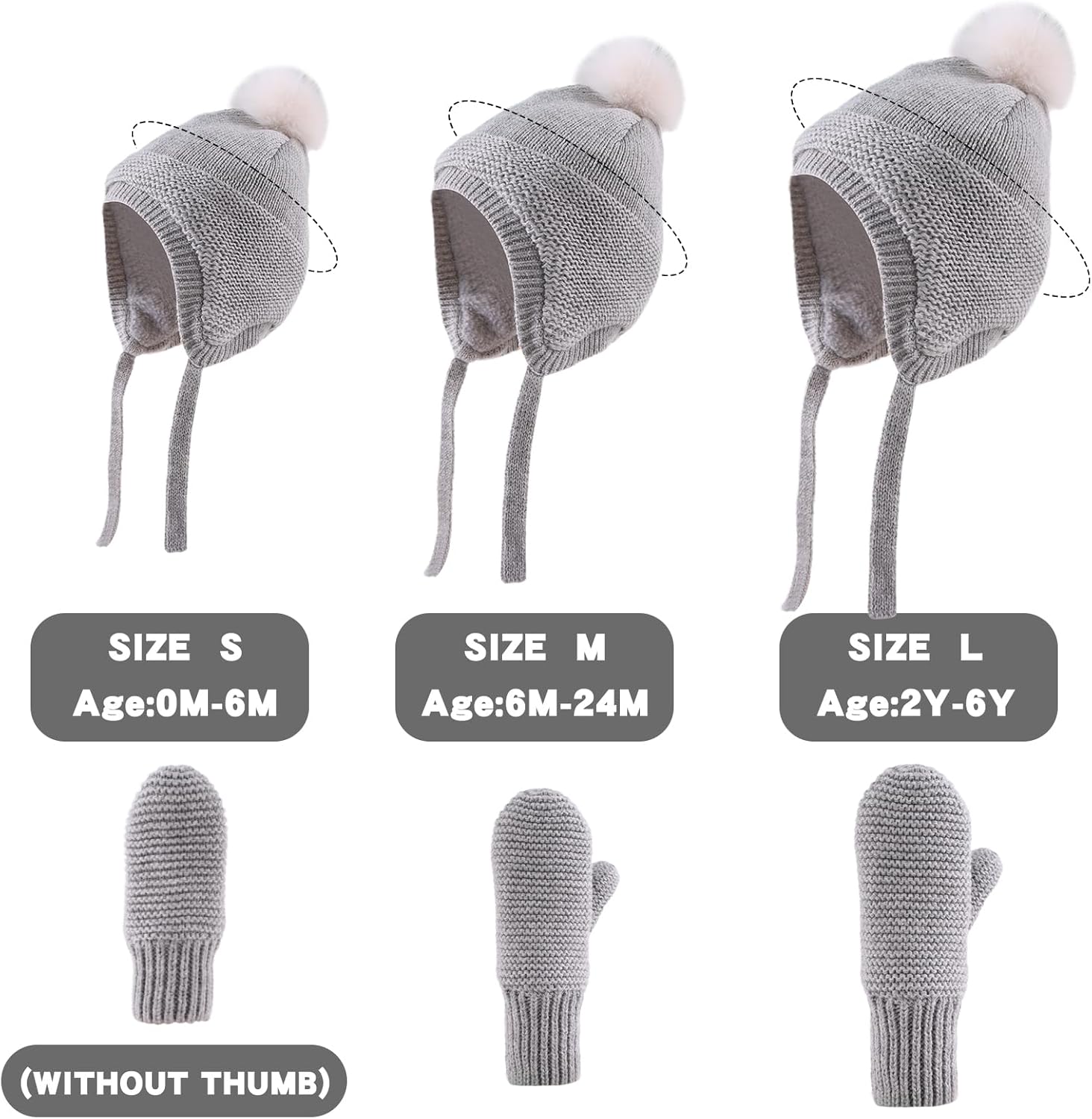 • SIZE CHART: Our children's beanie hats with pom and mittens set comes in 3 different sizes. The small size is suitable for infants aged 0-6 months, the medium size is perfect for toddlers aged 6-24 months, and the large size is designed for kids aged 2-5 years old. The fleece-lined fabric of the hat provides excellent stretch and heat retention, allowing each size to accommodate a wide range of ages. Please take note that the gloves of small size without thumb holes.