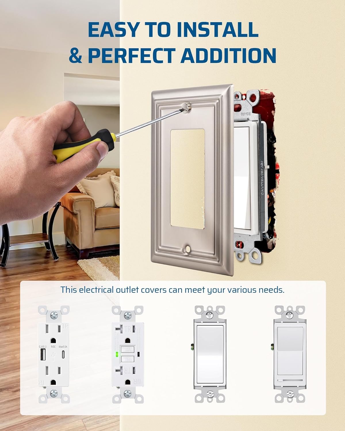 • [Decorative Wall Plate] Feature a brushed nickel finish with a fine, even brushed texture, blends into any decor style; ideal for the living rooms, bedrooms, bathrooms, and kitchens, enhancing the look of your home