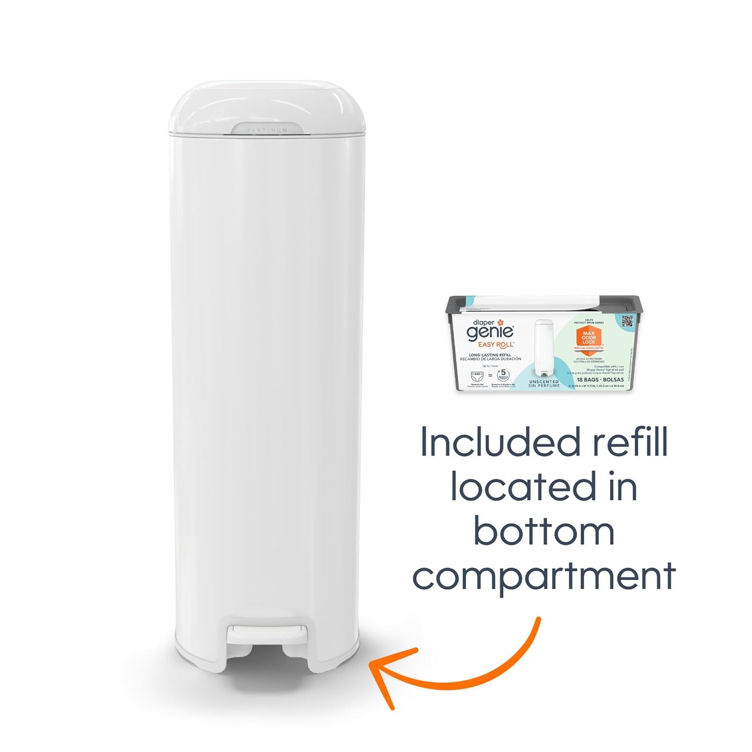 Diaper Genie Platinum Pail (Sage Green) is Made in Durable Stainless Steel and Includes 1 Easy Roll Refill with 18 Bags That can Last up to 5 Months.