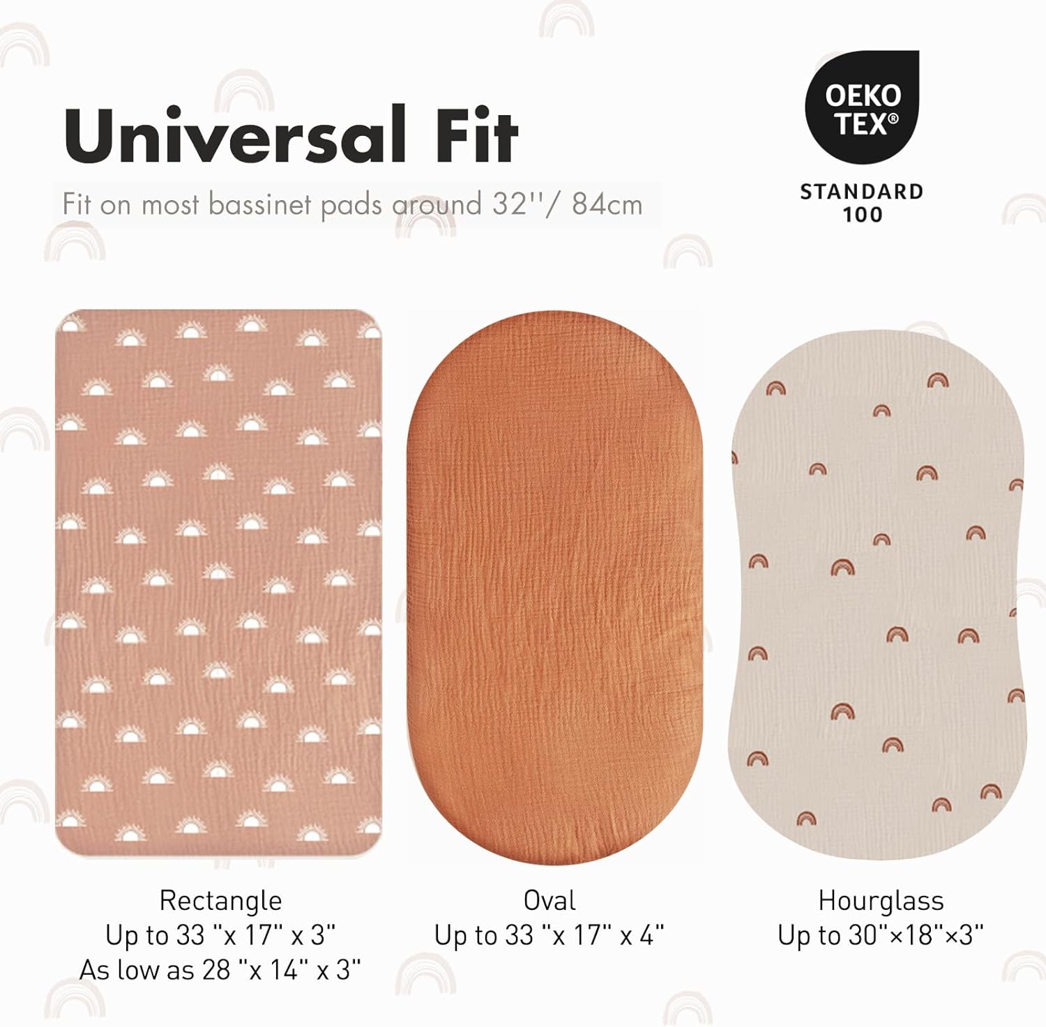 • ONE SIZE FITS ALL (33"x17"x4"): Designed for universal use, our bassinet sheets fit most bassinets, baby loungers, cradles, and co-sleepers. They accommodate standard, oval, round, rectangular, and hourglass-shaped mattresses. The elastic band provides a snug, secure fit while making sheet changes quick and easy