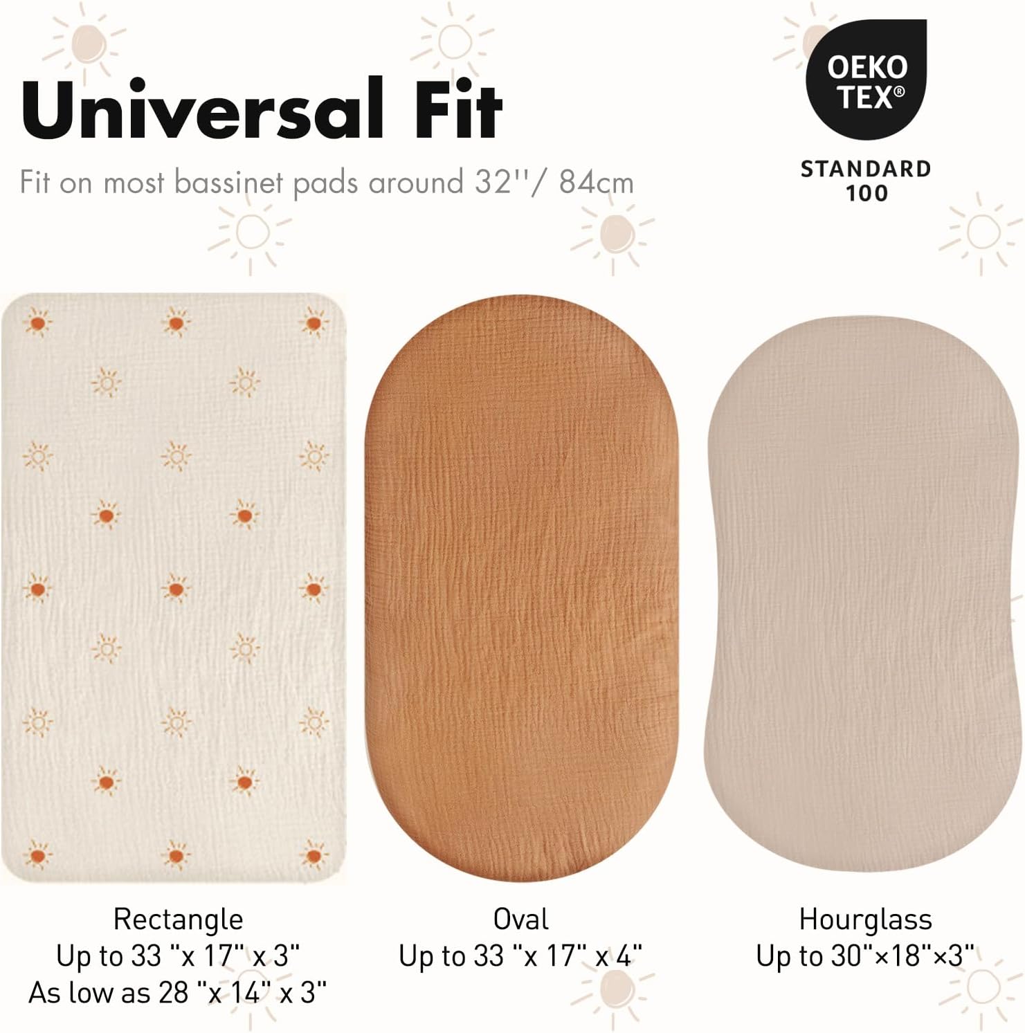 • ONE SIZE FITS ALL (33"x17"x4"): Designed for universal use, our bassinet sheets fit most bassinets, baby loungers, cradles, and co-sleepers. They accommodate standard, oval, round, rectangular, and hourglass-shaped mattresses. The elastic band provides a snug, secure fit while making sheet changes quick and easy