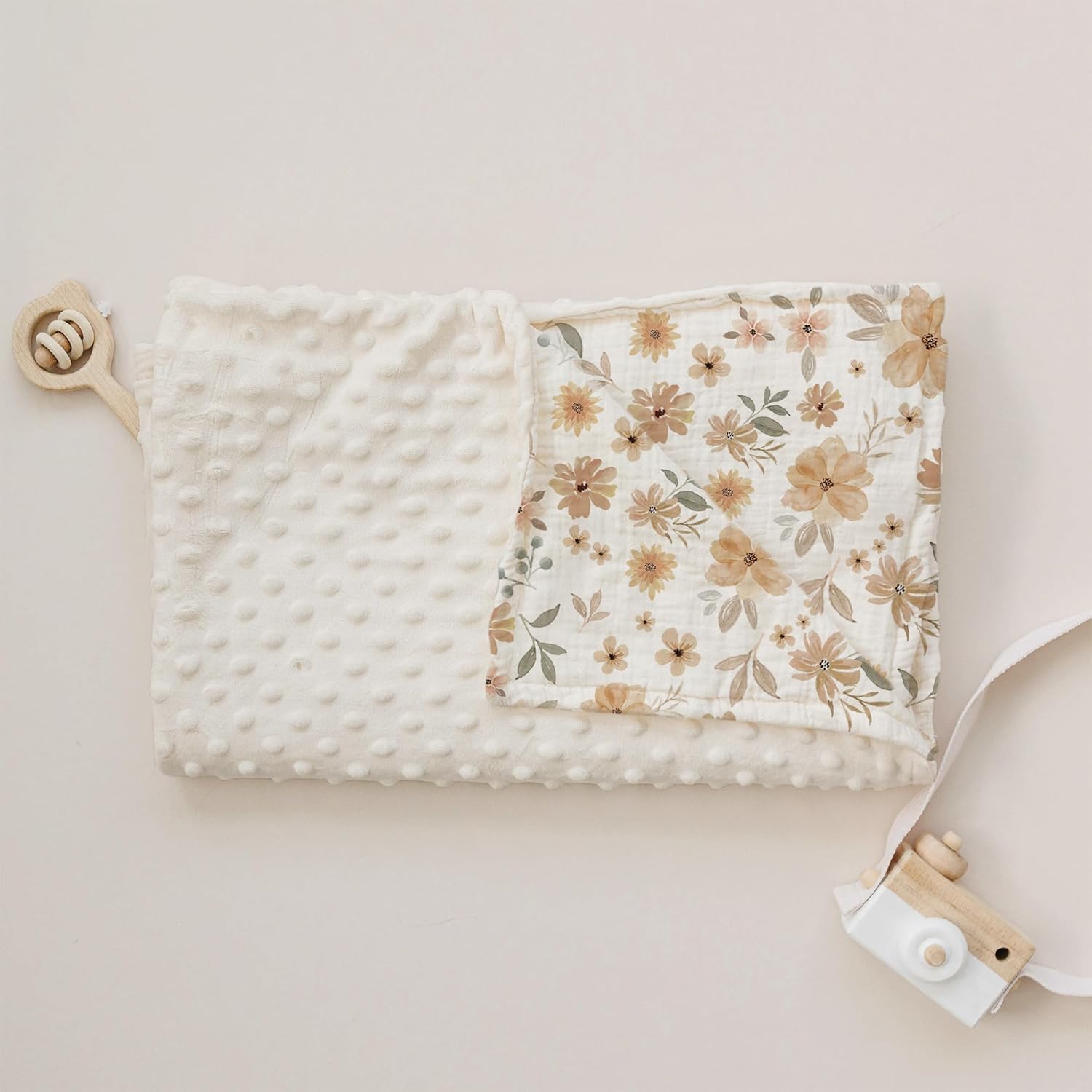 Konssy Baby Blankets for Unisex Boys Girls, Super Soft Nursery Minky Blankets with Muslin Cotton Front and Dotted Fleece Backing, Printed Bed Throws Newborn
