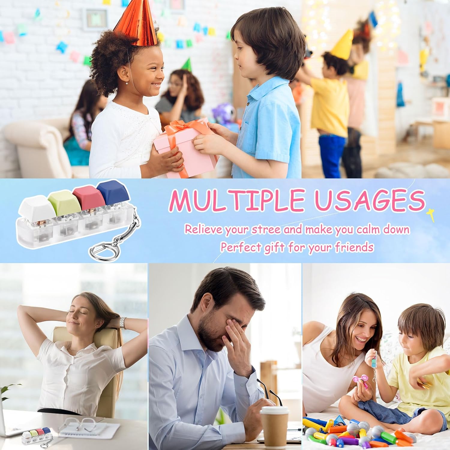 • Stress and Anxiety Relief: with every crisp clicking sound, the keyboard fidget clicker helps in calming your mind and relieving stress and anxiety; The satisfying click sound and the rhythmic pressing action make the toy ideal for maintaining focus and improving concentration
