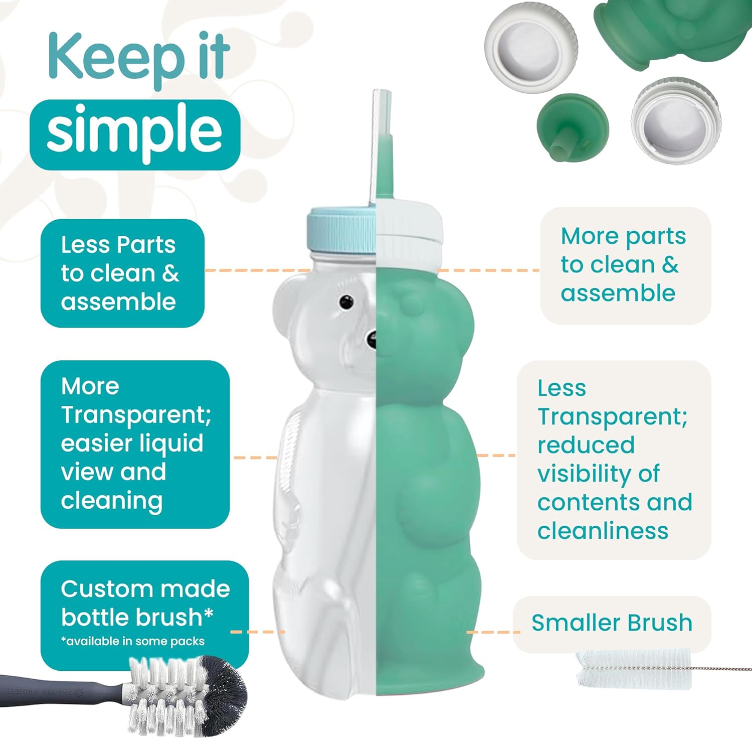• Complete Set: Our easy squeeze straw cups set comes with 2 bottles + lids, 4 straws, a custom bottle brush, & a straw cleaner. These BPA-free & recyclable honey bear bottles with straws are leak-resistant, dishwasher-safe, & easy to clean & maintain.