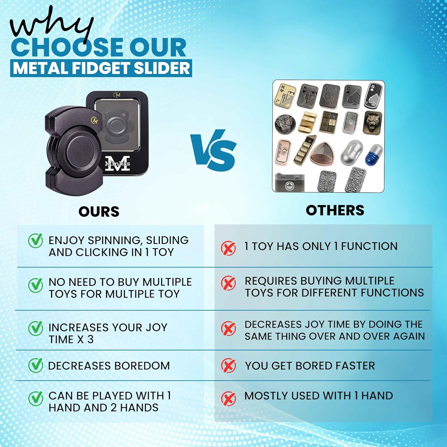 • ✖️🙌 [ MULTIFUNCTIONAL FIDGET SLIDER / SPINNER AND CLICKER ] The fidget slider stands out for its exceptional versatility, offering three functions in one device: clicking, spinning, and sliding. Its multifunctionality makes it a remarkable addition to anyone's collection of fidget toys, providing endless entertainment. It also provides cost savings by combining multiple functionalities into a single device. This makes it a practical and efficient choice for individuals seeking versatile fidget toys.