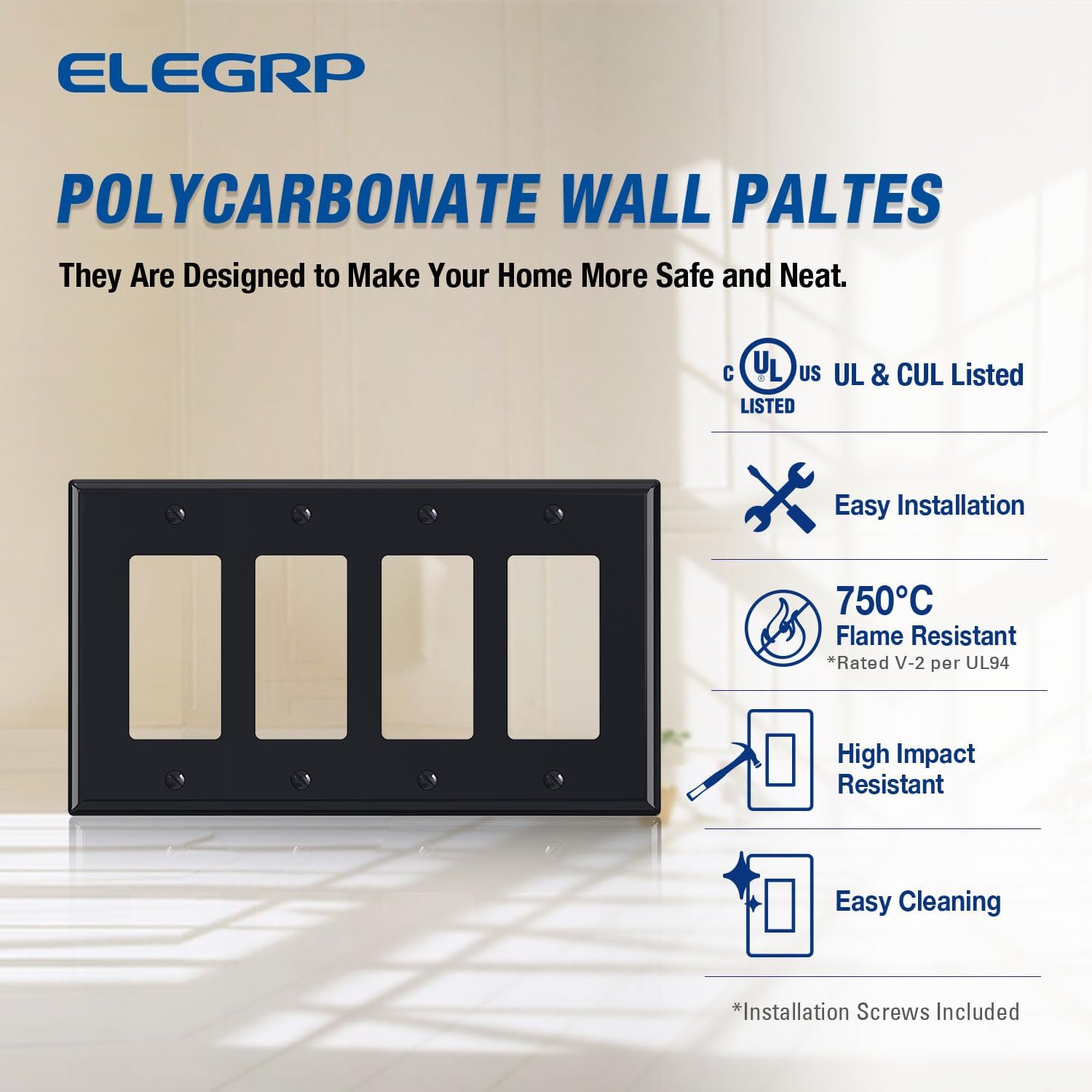 ELEGRP 4-Gang Decorative Wall Plates, Mid-Size 4.88" H x 8.57" L Unbreakable Thermoplastic Faceplate Cover for Decorator Receptacle Outlet Switch, UL Listed (1 Pack, Glossy Black)