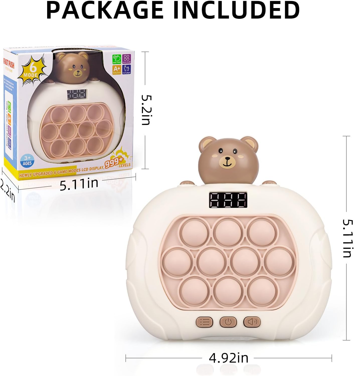 Fast Push Game Pop Fidget Toys for Kids, Fast Push Bubble Game, Handheld Puzzle Game Sensory Toys with LED Screen, Quick Push Light Up Game Gifts for 3-12 Year Old Girls Boys (Bear)