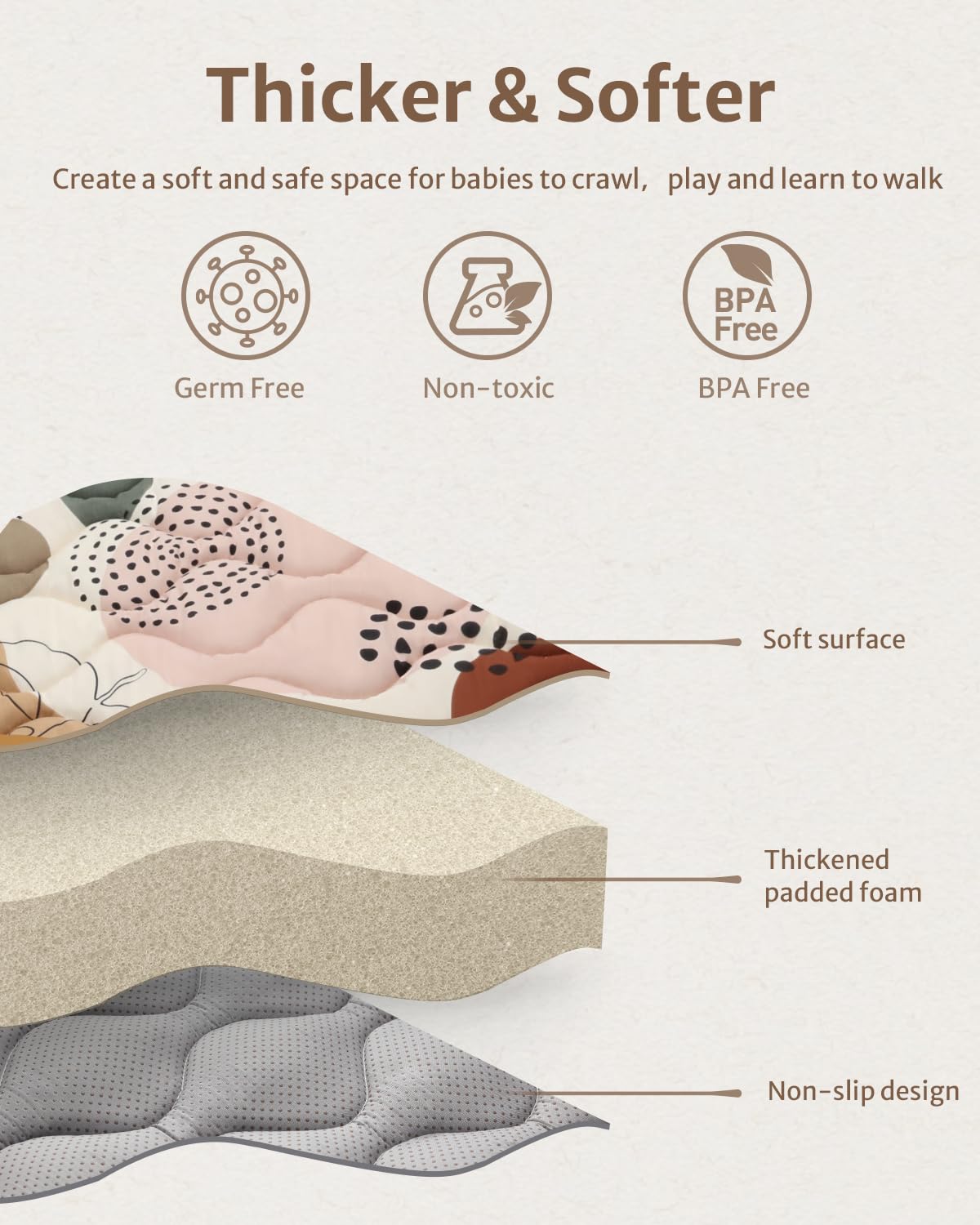 • Thicker & Soft Premium Foam - Our baby play mats for floor is thicker than most other brand baby play mat. And it's made of premium soft padding foam and fabric top layer to ensure a soft and cushioned surface, providing a comfortable place for your little one to relax, play and work on their developing skills