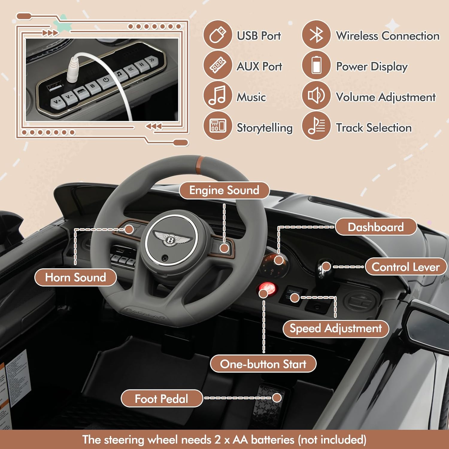 • 【Officially Licensed Bentley Bacalar】This licensed Bentley ride-on car features a super cool appearance that appeals to kids a lot. Double doors with locks and gas rods as well as realistic rear mirrors mimic the outlook of a real Bentley. Moreover, 2 × 12V powerful motors and a 12V rechargeable battery ensure profound performance.