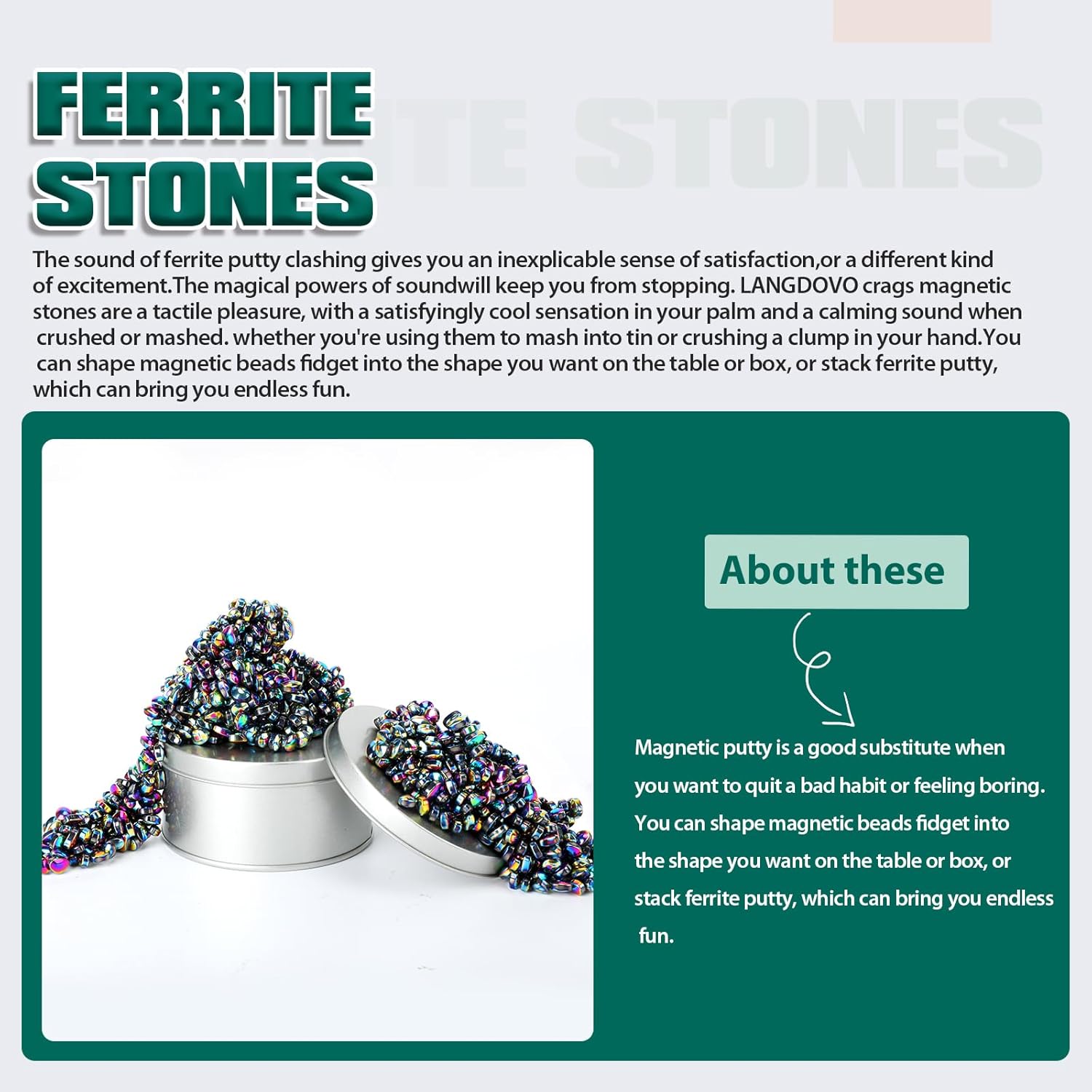 - 1.Enjoyable Desk Toy:LANGDOVO magnetic putty consists of mini weak magnets stones.Over 600 magnetic beads fidget,fill your hand up with the Ferrite Putty.Mash them ,stack them,and feel pressure slip away as the stones slip past your fingers.Grab crags magnetic stones in the palm of your hand while you are dealing with the boring job.