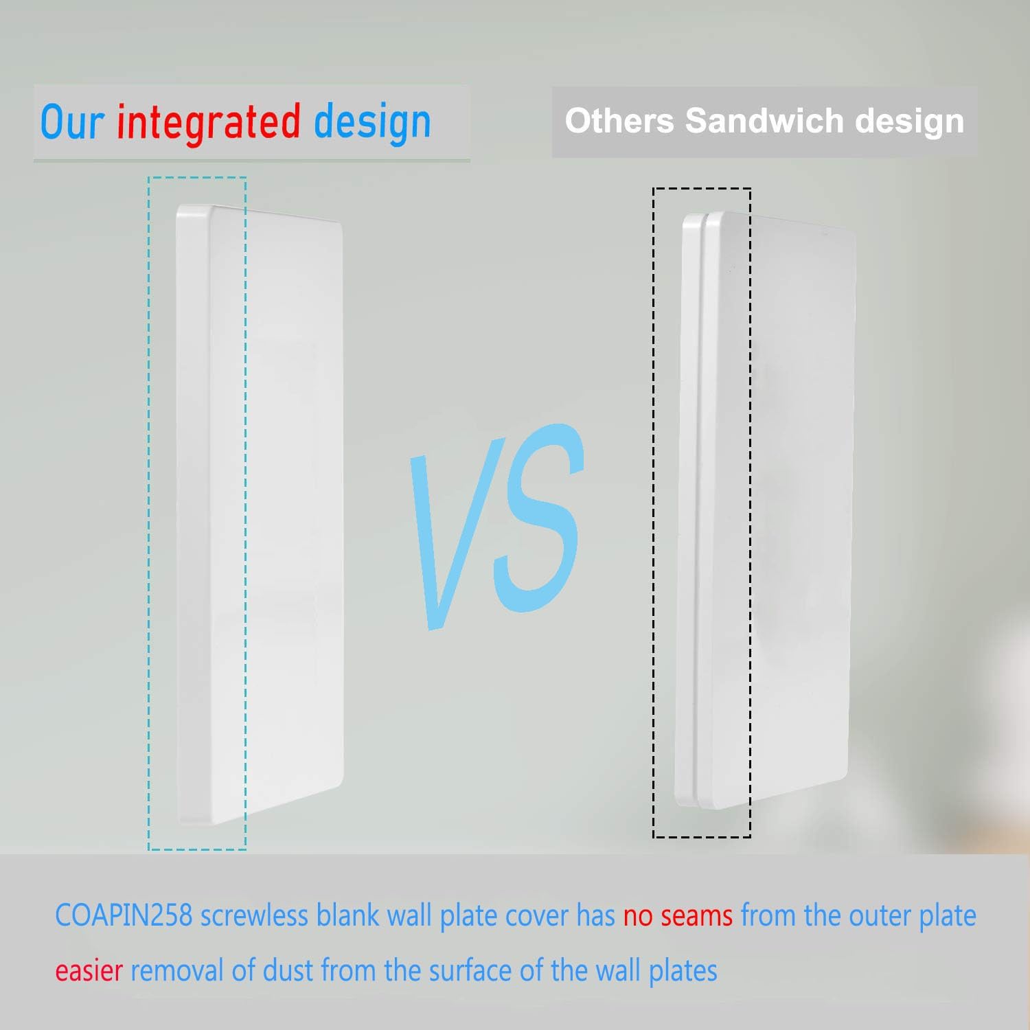 • 【Safe and High Quality】COAPIN258 blank wall plate cover is no visible screw design for child safety. Fire resistant material with no fire hazard. Switch Outlet cover is made of durable unbreakable polycarbonate thermoplastic, blank outlet cover is flexible and resilient which can withstand bends, twists, hard impacts and heavy force, light switch cover plate heat resistant to temperatures over 100°F to protect against discoloration and fading over time.