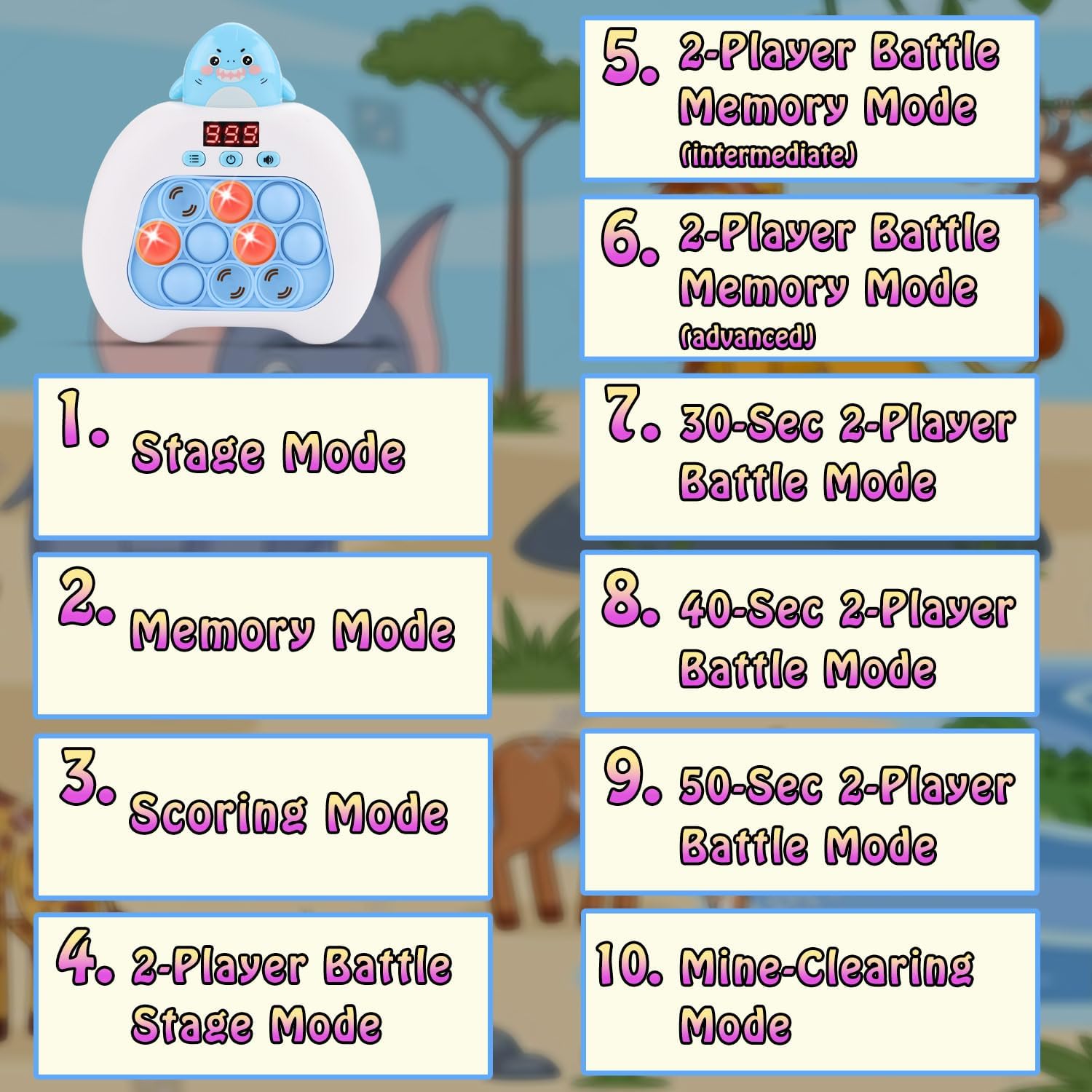 • Multi-Mode Interactive Game: Our handheld game console, the Speed Push Pop, offers four fun game modes - stage mode, memory mode, scoring mode, and multiplayer mode. Each mode provides a unique way to play and enjoy the game, and the console's unique shape design makes it an excellent puzzle game and decompression tool for both children and adults.