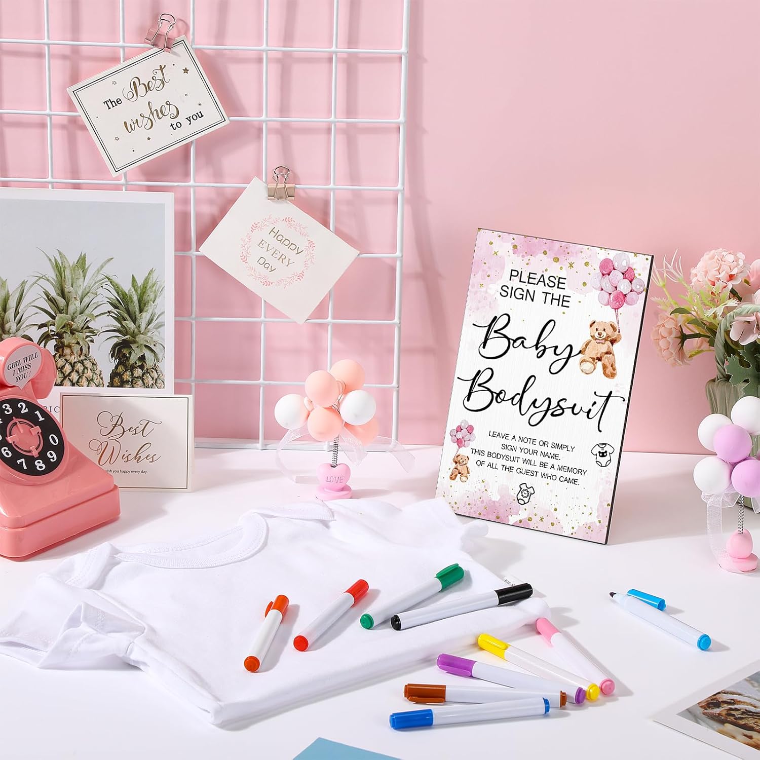 Qunclay 12 Pcs Baby Bodysuit Baby Shower Game Include 1 Game Wooden Sign Tabletop Decor 1 White Blank Newborn Bodysuit 10 Fabric Marker for Gender Reveal Party(Pink Bear)