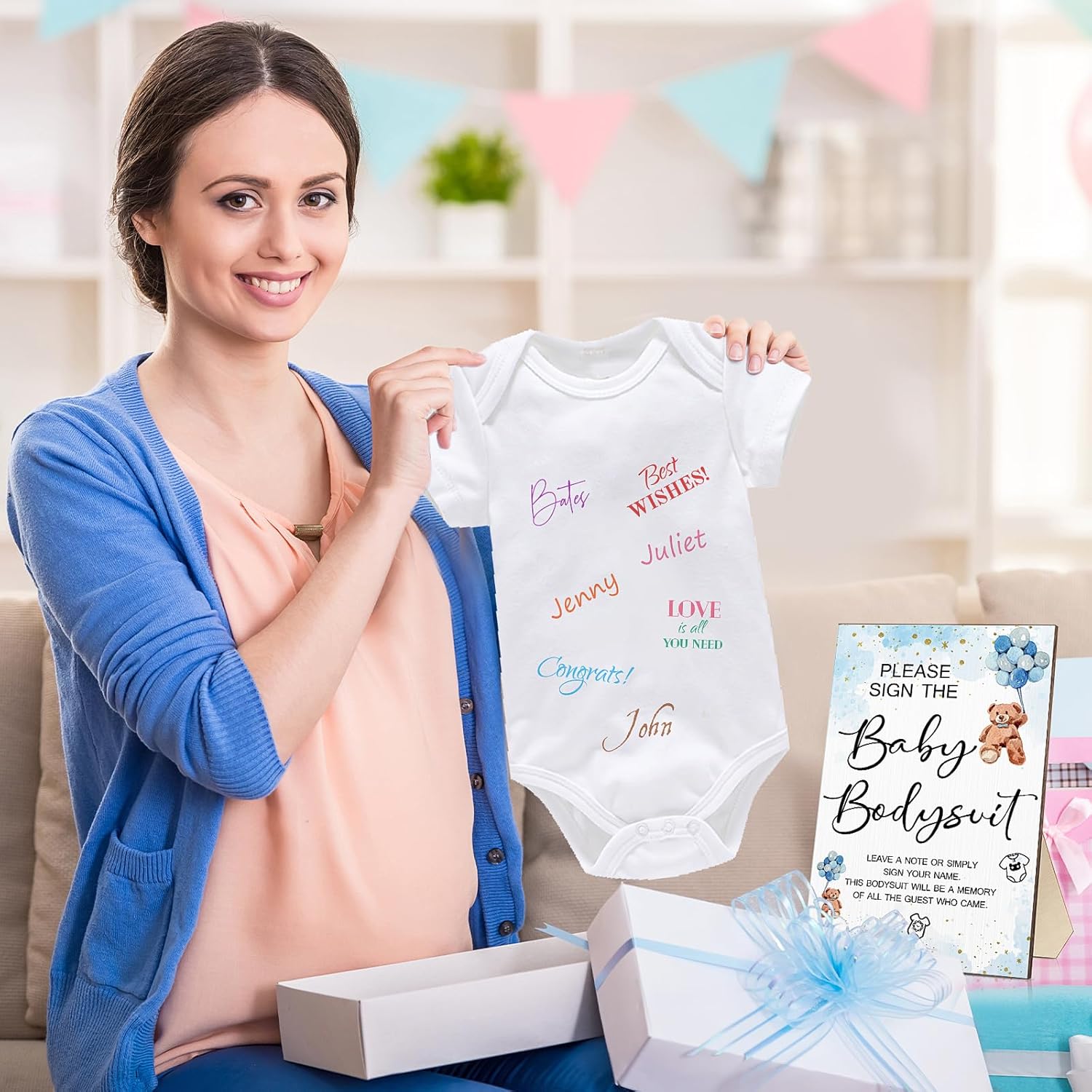 • Nice and Complete Set: there is 1 piece of wooden sign, 1 piece of white bodysuit for baby, and 10 pieces of colorful markers, abundant quantities and nice combinations to satisfy your daily using and baby shower needs