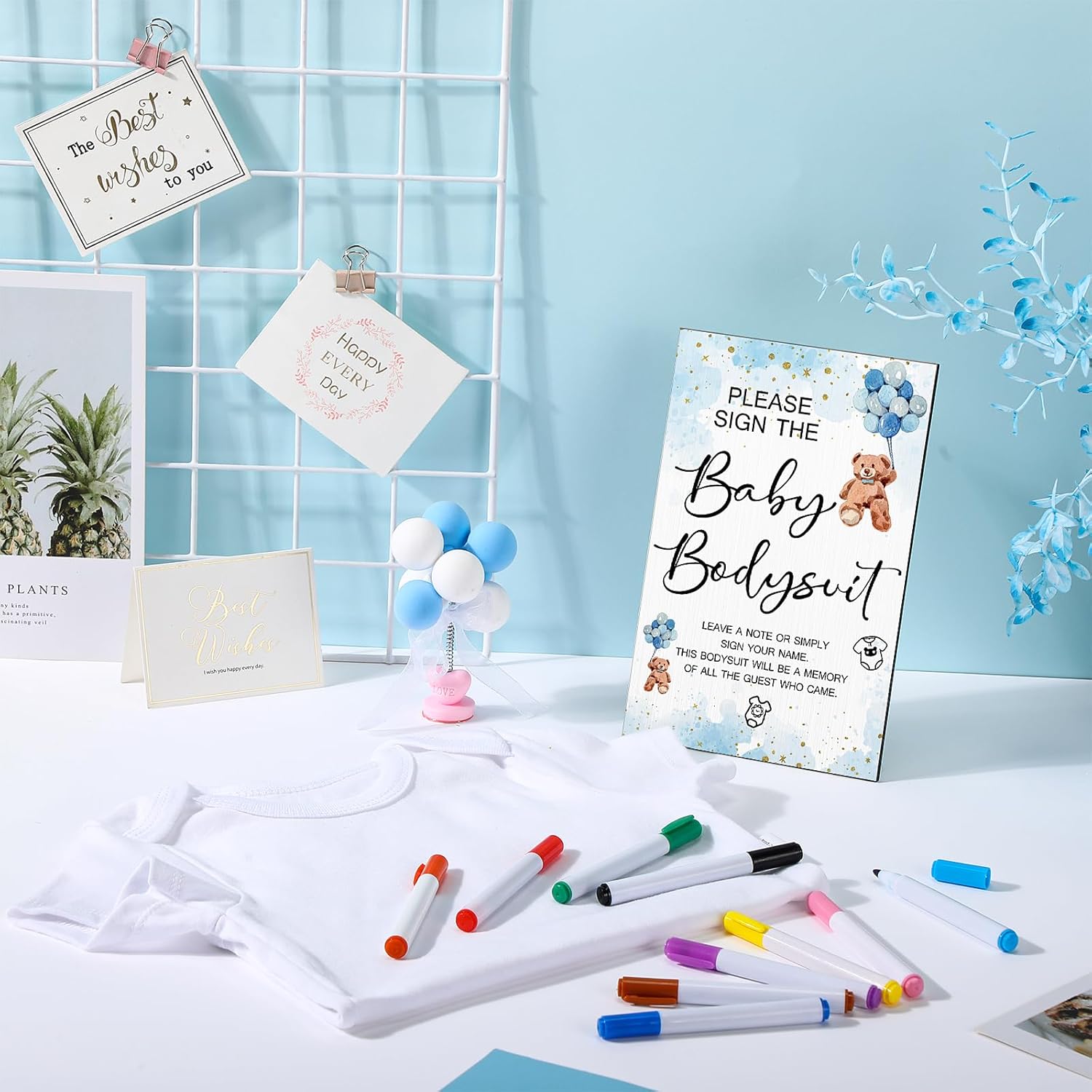 Qunclay 12 Pcs Baby Bodysuit Baby Shower Game Include 1 Game Wooden Sign Tabletop Decor 1 White Blank Newborn Bodysuit 10 Fabric Marker for Gender Reveal Party(Blue Bear)