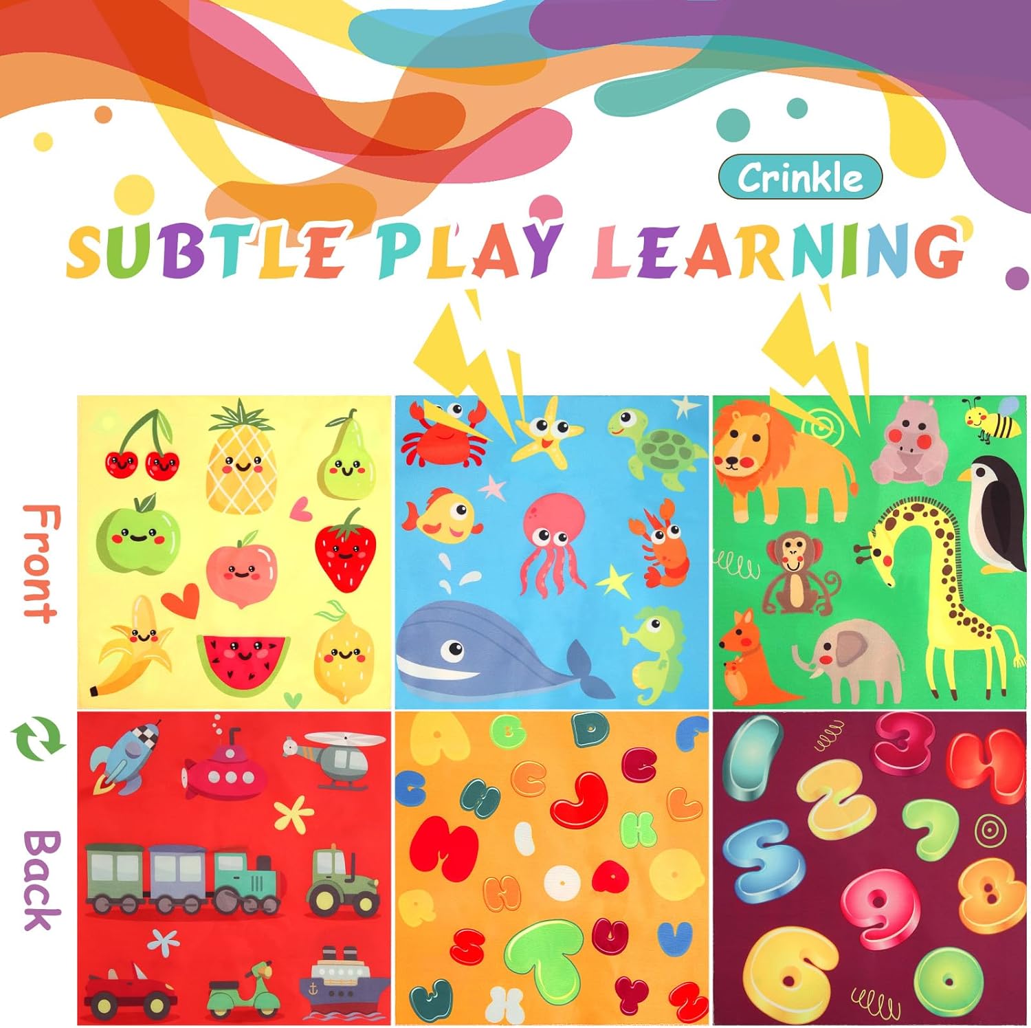 - 【✅Colorful Early Education Toys】Cute theme sensory tissue box toy for 6 to 12 months baby. We've designed 6 adorable graphic themes for toddler learning activities,including alphabets, numbers, animal , vehicles, oceans, fruits and 8 colorful silk scarves ,developing the skills of learning colors,numbers and alphabets, and enhancing cognitive.Babies will be attracted by this bright and creative interactive sensory toys box.