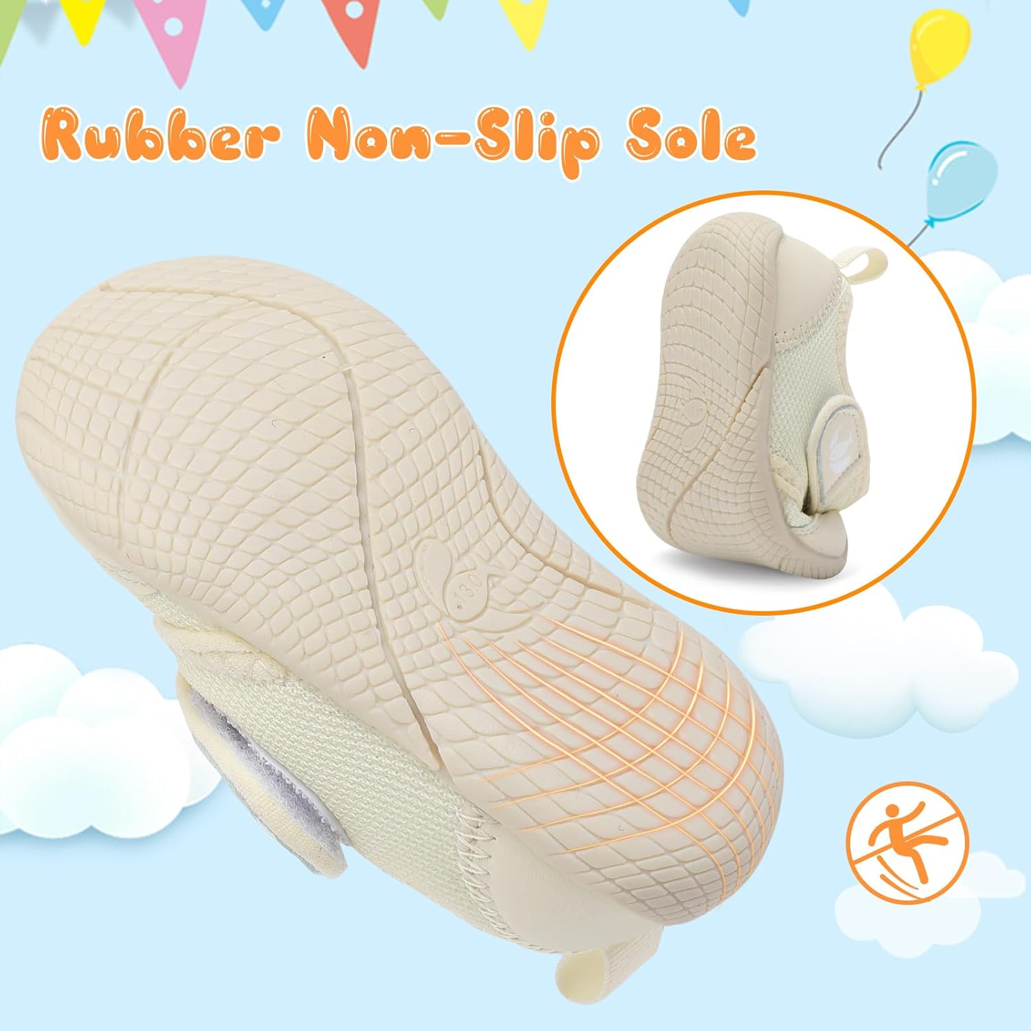 • Sole: The rubber sole has more elastic and excellent anti-collision performance. Safe baby sports shoes, with soft rubber soles with anti slip points, can make your baby not slip easily when crawling or walking.