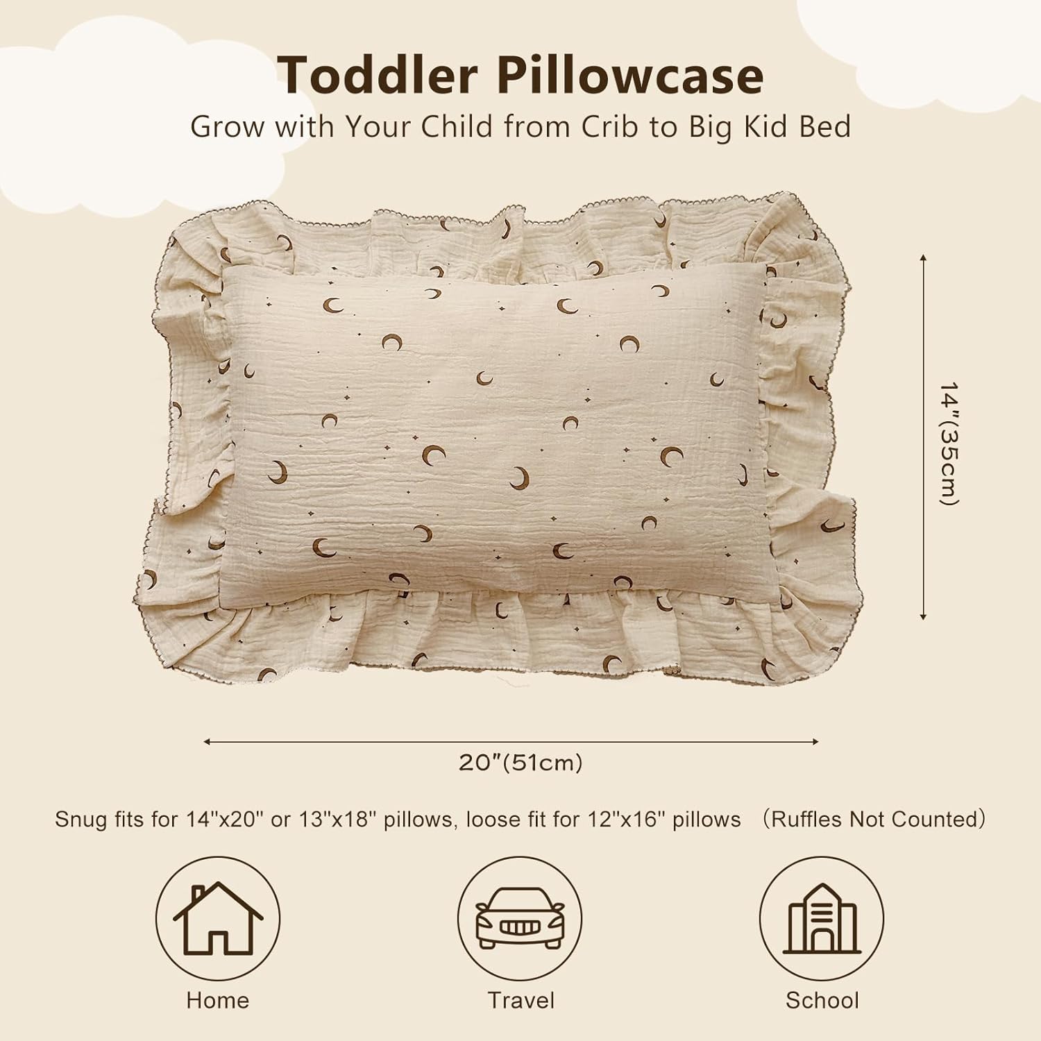 • Multifunctional: Our toddler pillowcase is suitable for various settings, including cribs toddler beds or even during travel. It's a versatile addition to your toddler's bedding collection. Muslin pillowcase provides a gentle touch against children delicate skin, promoting a restful night's sleep