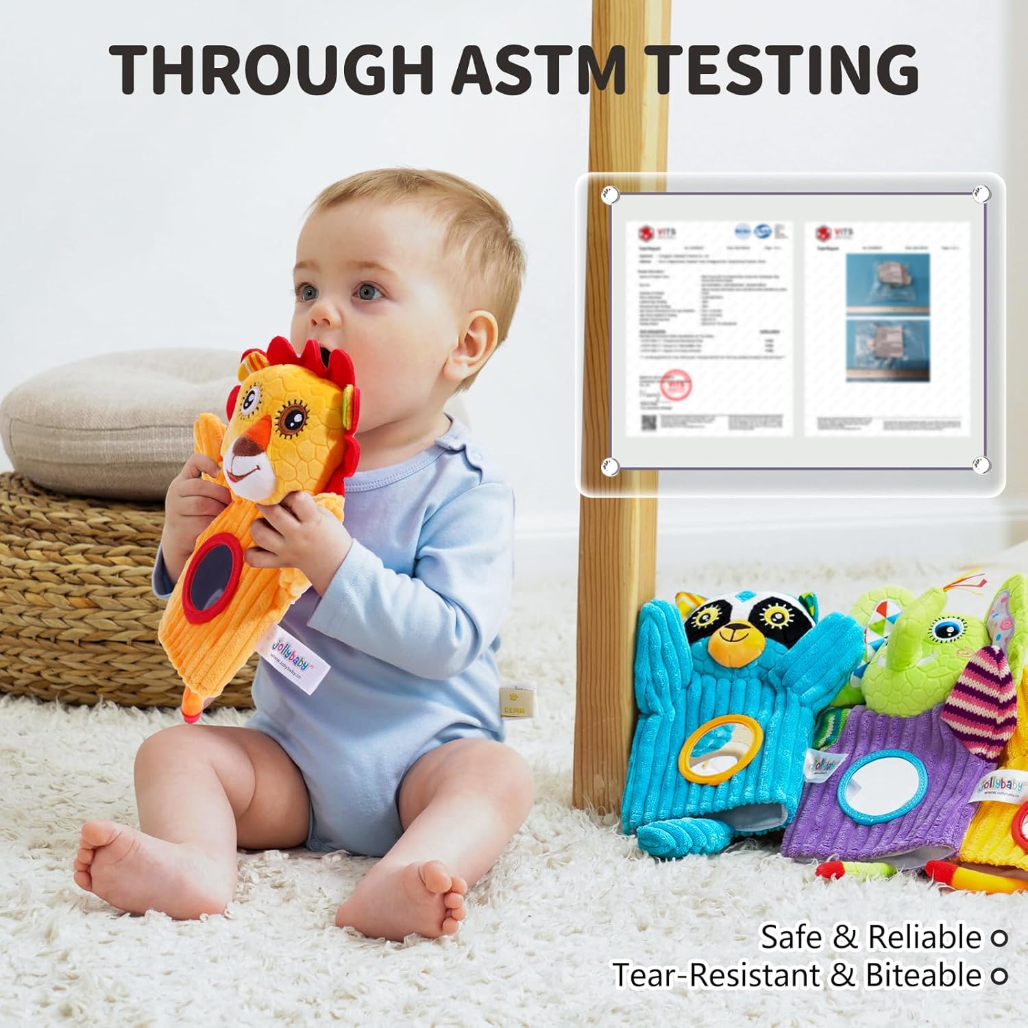 Jollybaby Hand Puppets Baby Toy 0-6-12 Months, Plush Stuffed Animal Hand Puppets Toys for Kids,Sensory Doll with Rattle and Mirror for Toddler,Social Emotional Play Therapy Toys for Boy Girl Gift