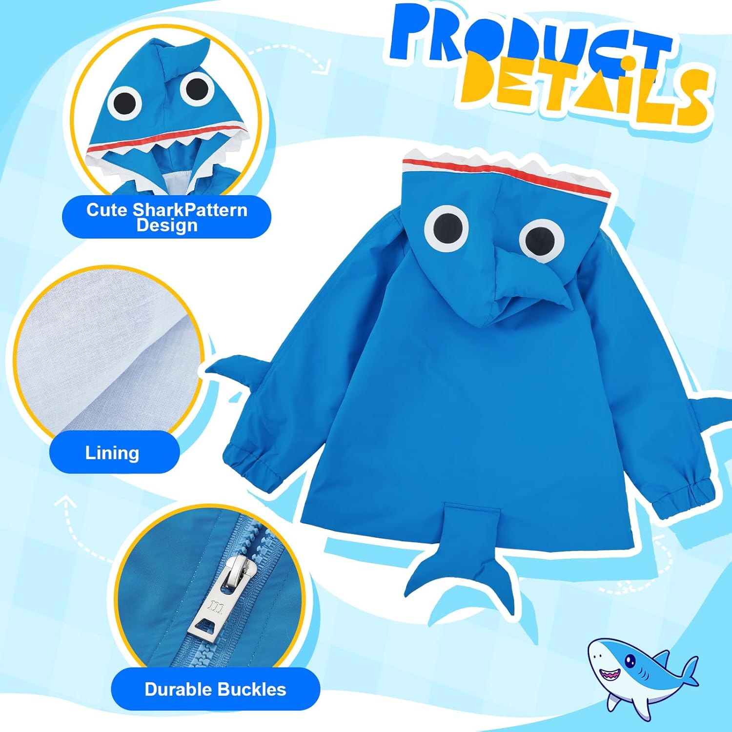 • Adorable Design and Color: our blue raincoat has a lovable shark design that adds a cute touch; The raincoat is lovely and vivid, and will make your toddler gets excited about wearing their rain coat