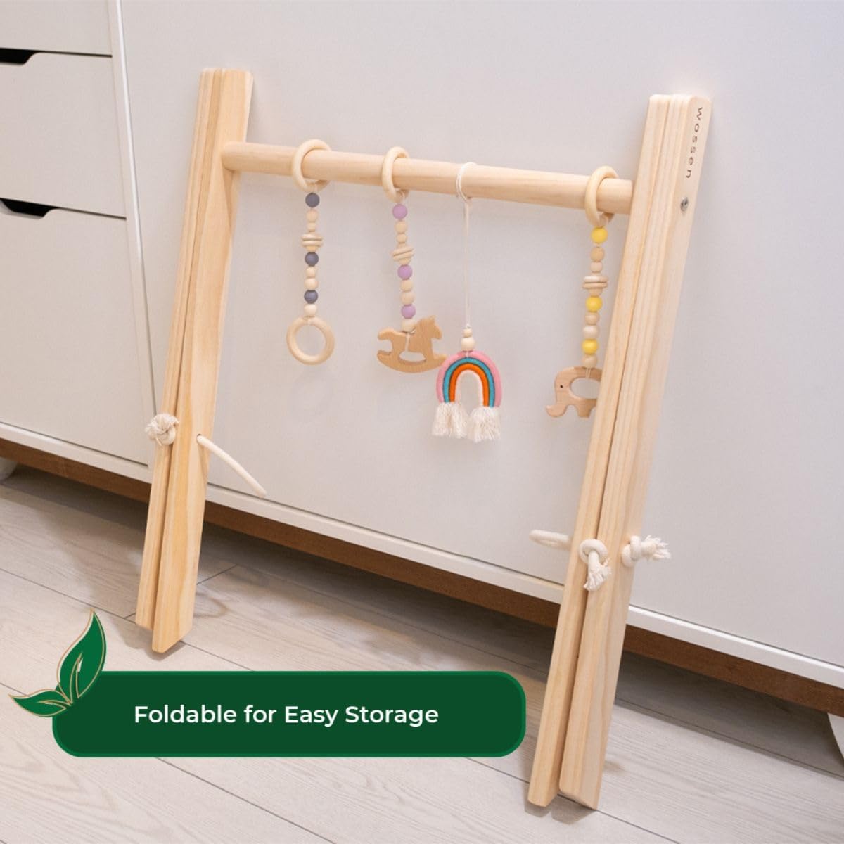 • Natural Wooden Toys: Wossen Baby PlayGym Set draws attention with its natural wooden toys. Designed with your baby's safety and health in mind, these toys are environmentally friendly while improving their tactile and visual perception.