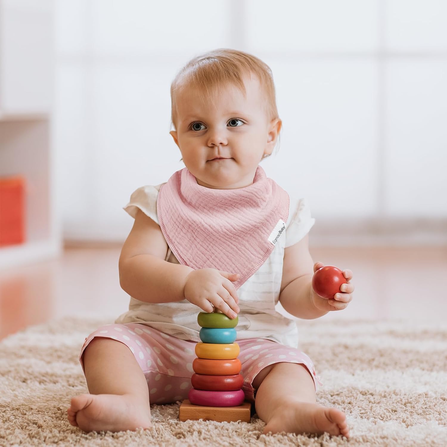 • Super Absorbent Muslin Bandana Bibs - Egmao baby muslin bandana drool bibs are made of soft organic cotton (Muslin) on the front and polyester on the back for added absorbency. Drool bibs for baby boy girl and this dual layer design helps to keep your baby clean and fresh all day long.No more drool rings on your baby's clothes!Most important the quality of fabric also as well as the bright colors with no chemical like smell and that have kept their shape and color after washing