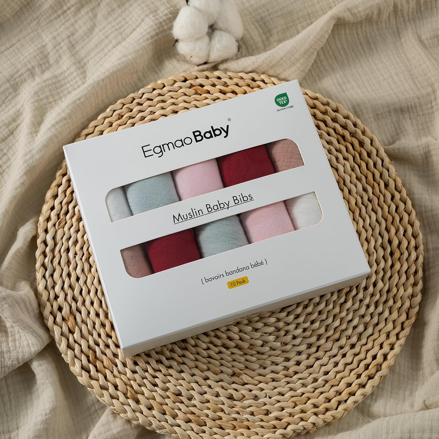 • 10-Pack Cute Baby Muslin Bibs for Boy and Girl - Our 10 pack muslin baby boy bibs and girl bibs are exclusively designed by egmao baby to ensure that your baby never runs out of styling options. Our baby muslin bibs are unisex and easy to match, making them a fuss-free teething baby essential.
