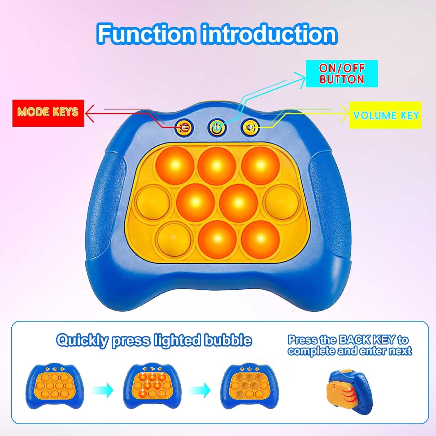• Fun to Play: Select the modes you want to play then enter the game mode for the puzzle game machine, turn off all the lights by pushing the pop bubble, also there accompanied with customized ticking sound while turning ON/OFF the game machine.