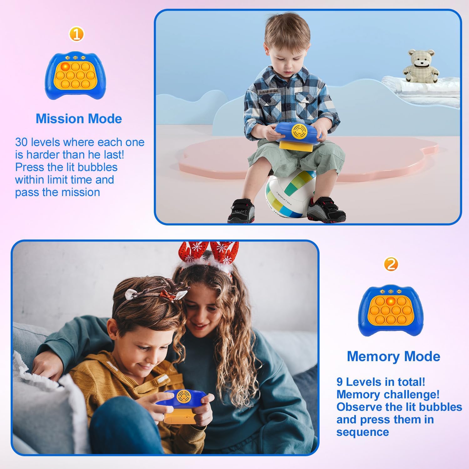 • Game Machine Design: The newest game machine appearance design adds more fun to this light-up puzzle game toy, it has vibrant bright color and 4 modes: mission mode, memory mode, scoring mode, multi player mode. Easy to attract all kids and all adults with creativity.