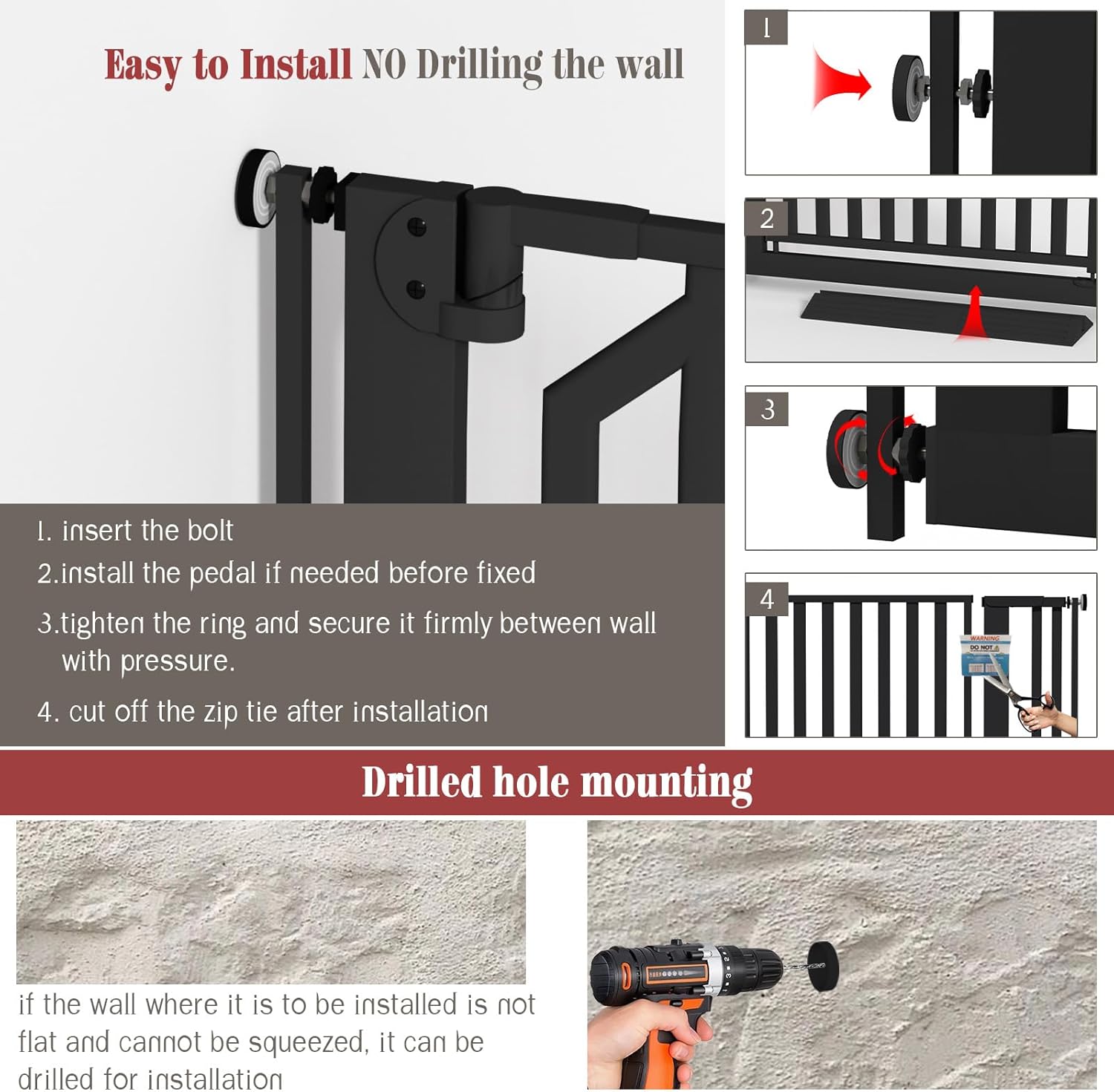 - 【Two Installation Methods】The baby gate has two installation methods. PRESSURE MOUNTING: The enclosure comes with 4 adjustable pressure bolts, no tools required, no drilling, no damage to house walls. Simply turn the nuts to secure or remove the gate from the wall or other surfaces for easy storage. DRILLING INSTALLATION: Simply drill holes in the wall and tighten the corresponding screws. Please do not cut the straps before successfully installing the extra high cat door, please follow the provided instructions carefully, if you encounter any installation problems, please contact us