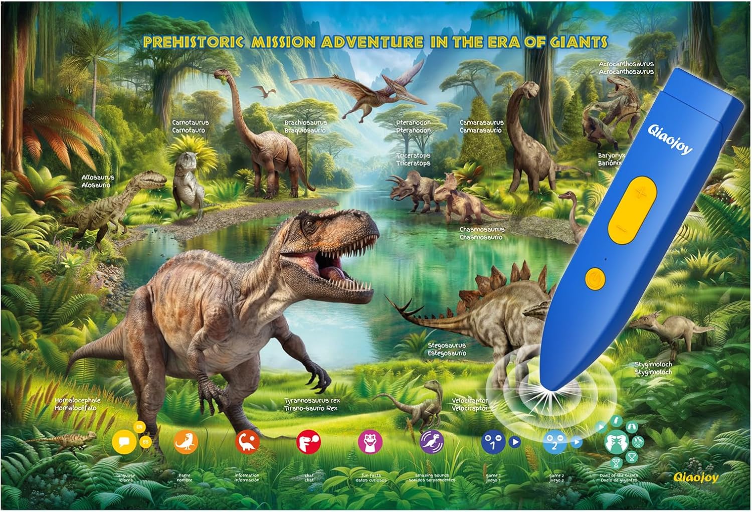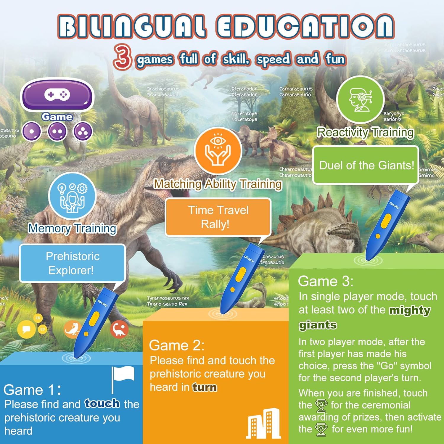 - 【Innovative Interactive Design】This Dinosaur Interactive Poster features 9 engaging modules, including bilingual mode, dinosaur species, information, chat, fun facts, amazing sounds, and three interactive games. With the audio pen, each touch reveals fascinating stories and facts from the prehistoric era. Offering bilingual support (English and Spanish) and personalized narration, it caters to children from diverse cultural backgrounds, making learning both fun and inclusive.