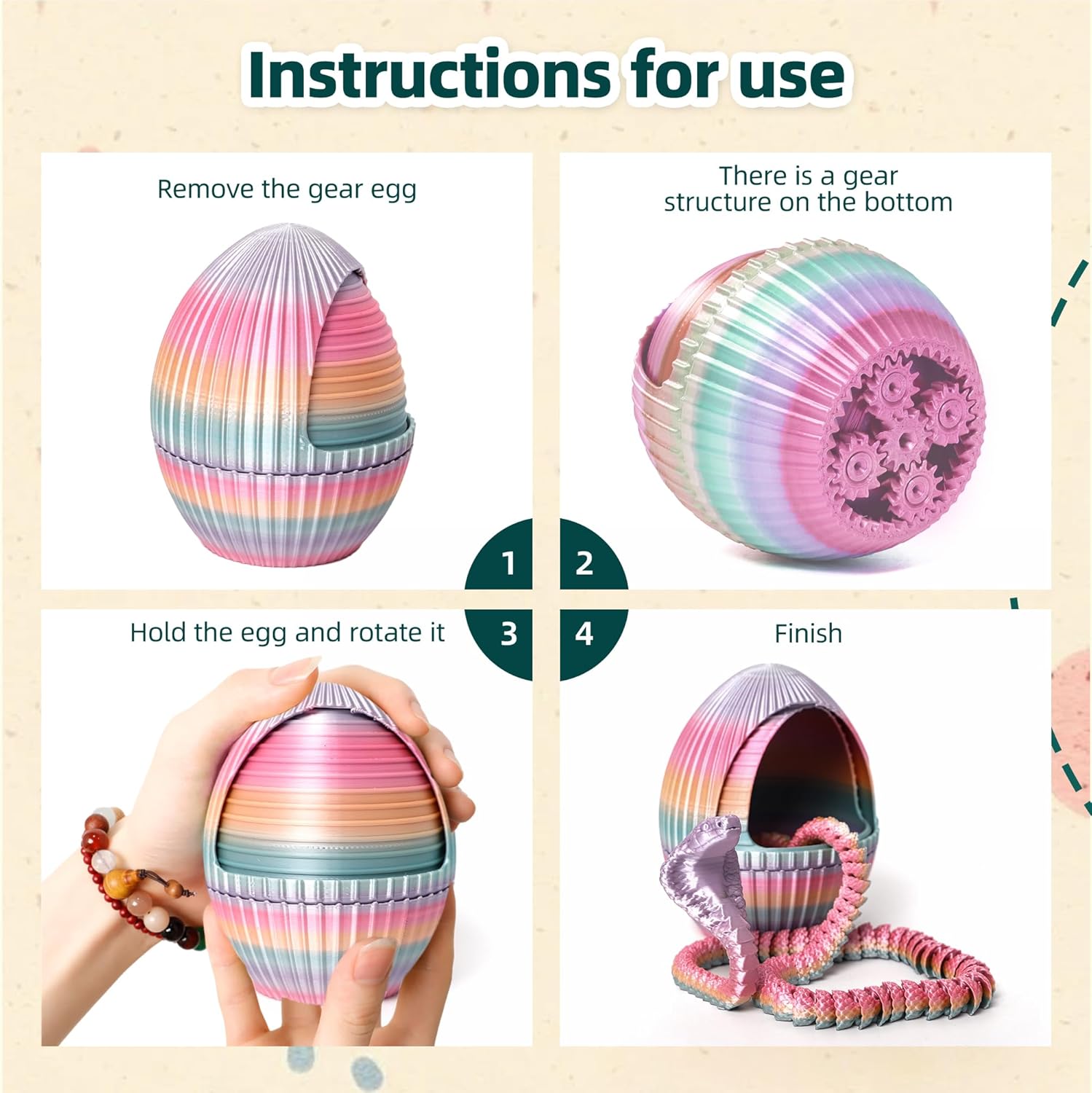 • Surprise Element: As you rotate the gears to open the egg, a 3D-printed animal, such as a snake or dragon, gradually emerges. This element of surprise adds unpredictability, increasing your curiosity and enjoyment.