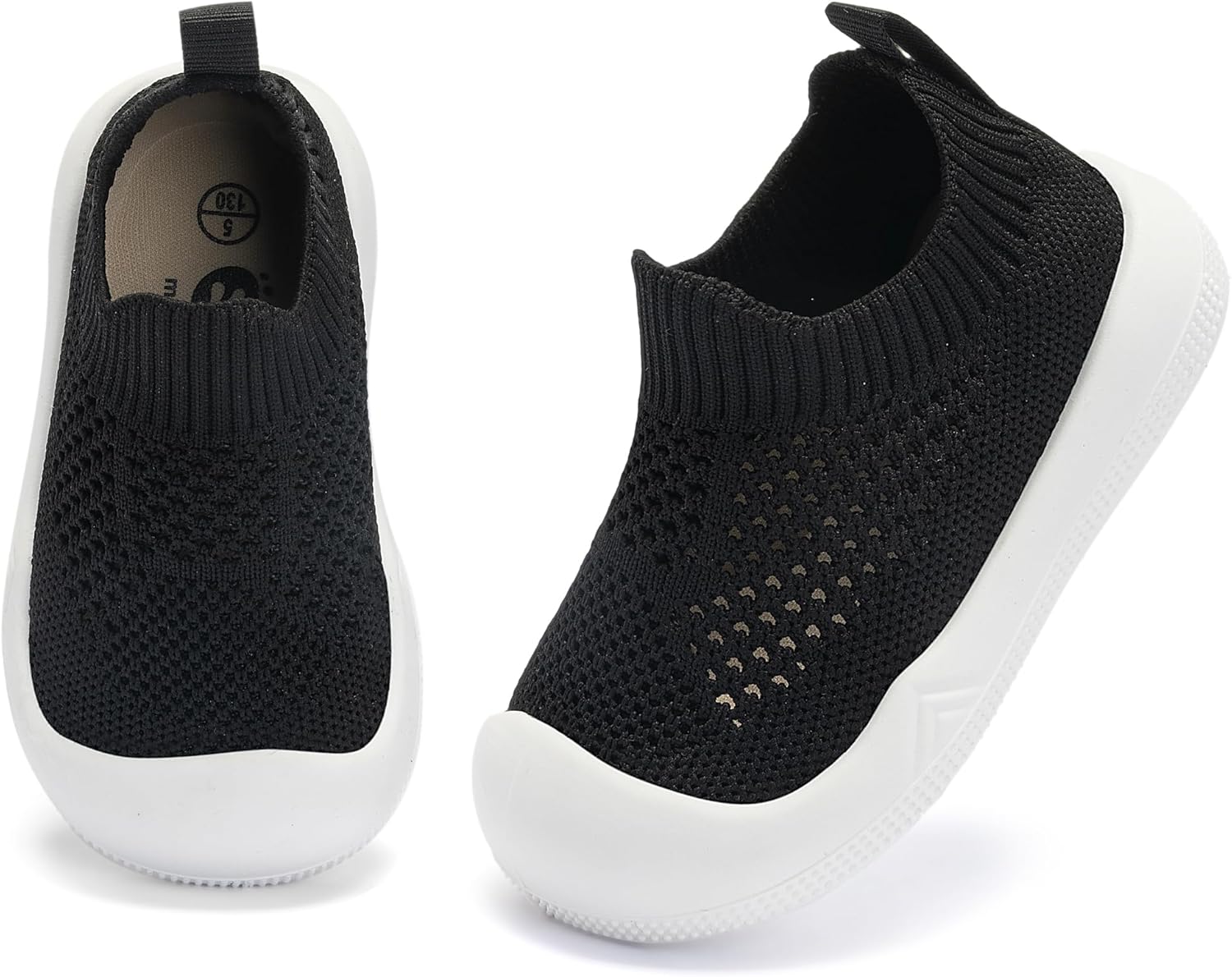 • Easy Put On:Baby walking shoes The one-piece design with stretchy knit collar only takes seconds to for you to slip them on, so babies can jump right into playtime. Toddler slip on shoes let them play in comfort while enjoying their time.