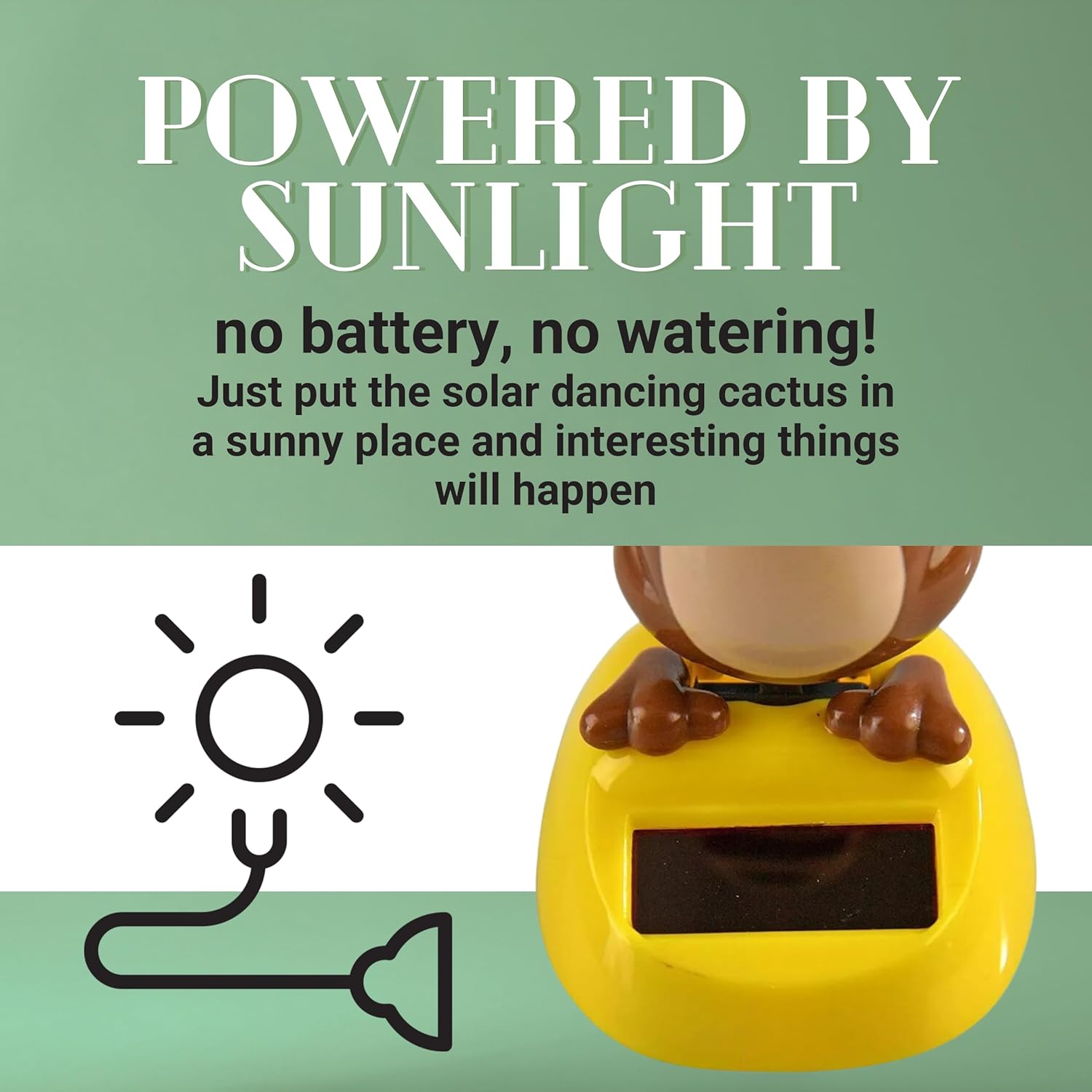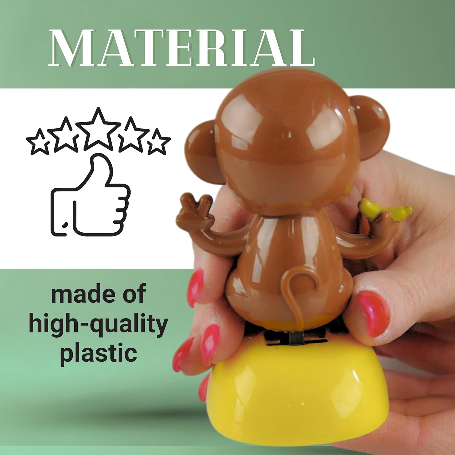 • Delightful little solar bobble heads for window and solar dashboard figures are a cute addition to any car, window sill, or desk. Embrace the joy of solar dancing figurines and add a touch of whimsy to your daily commute. Mesmerizing and fluid movements of this monkey toy figure will captivate both you and your passengers