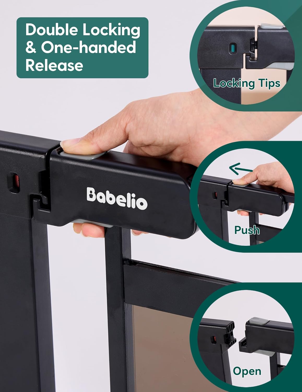 • Lock Verification: Babelio Clear Baby Gate uses a more advanced locking mechanism. When closed correctly, it will display green, but when it is open it will display red, which can better help you confirm whether the gate lock is closed properly