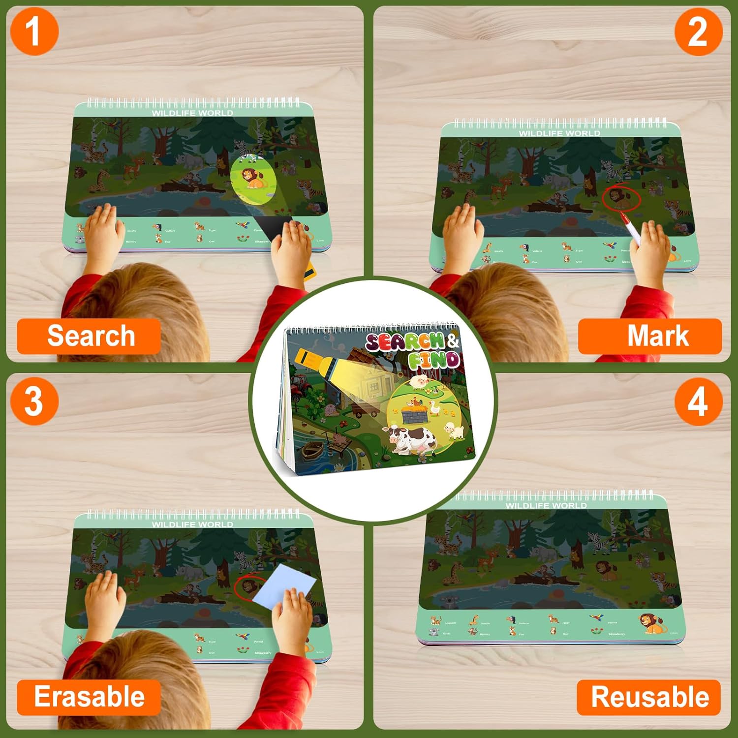 - 🚀Learn Through Play - This preschool learning activities is a good activities to motivate your kid's desire to explore. Kids will love to search and find with this activity mats, make best use of their observation skills to search the mats for objects and circle them with the included dry-erase marker. There are so many different scenes to explore, great way to expand your kid's vocabulary while exploring exciting places like the ocean, Amusement Park, Restaurant, wildlife world, and more.