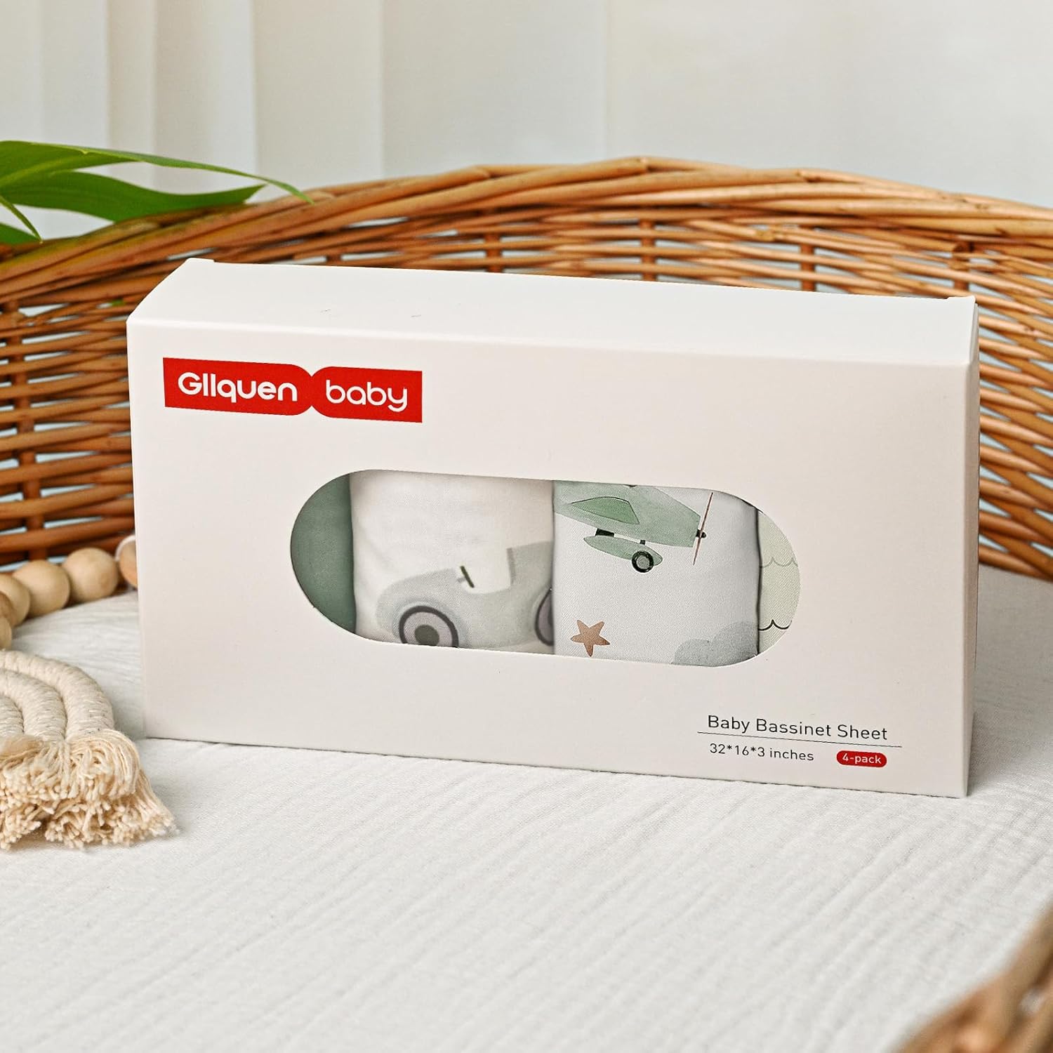 Gllquen Baby Bassinet Sheets 4 Pack, Breathable Cozy Fitted Mattress Sheet, Elastic Travel Crib Fashionable Pattern, Standard Cradle Safe Sheets for Baby Boys Girls 32"x16" (Car)