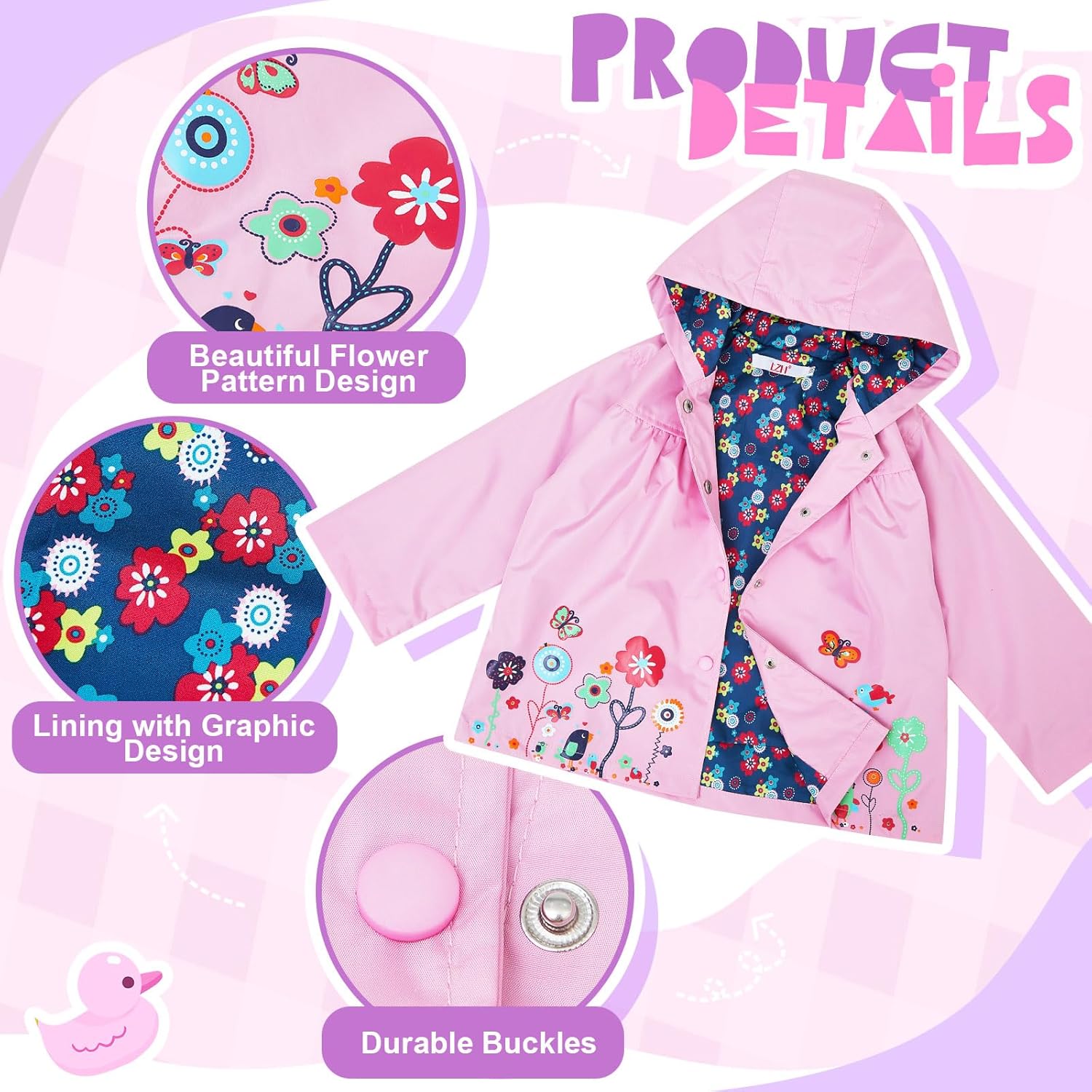 • Adorable Design and Color: our pink raincoat has a lovable flower design that adds a cute touch; The raincoat is lovely and active, and will make your toddler gets excited about wearing their raincoat